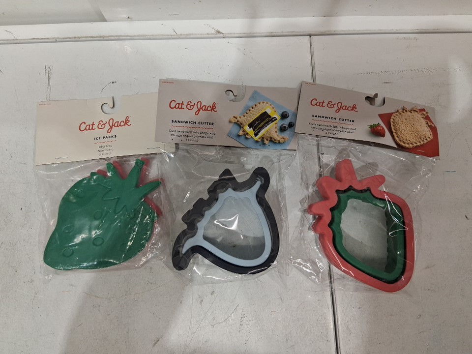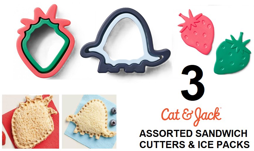 3 assorted strawberry dinosaur sandwich cutters and strawberry ice packs - blue / pink / green