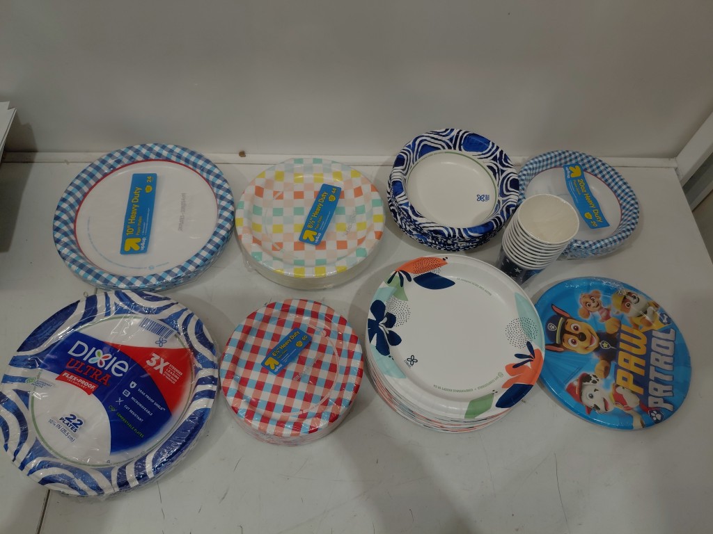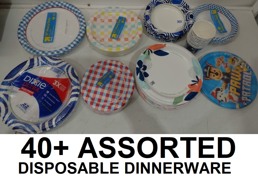 40+ ASSORTED DISPOSABLE DINNERWARE - PLATE, BOWLS, CUPS - ASSORTED STYLES & SIZES