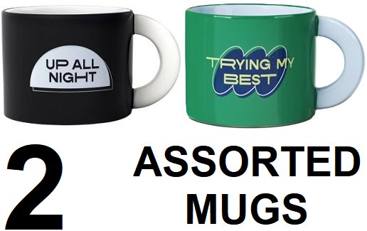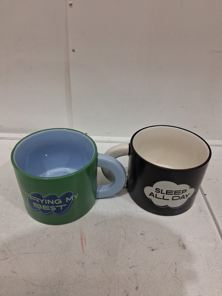 2 assorted coffee hot drink beverage ceramic mugs - "sleep all day", "trying my best" - black / blue / green