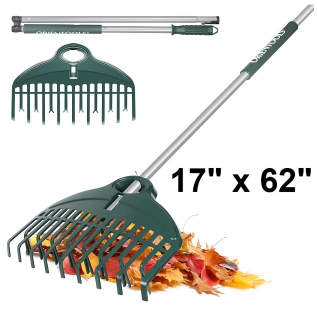 ORIENTOOLS foldable Garden Leaf Rake with double row tine - 17" x 62" - green (model: ‎CPX-008-SIA)