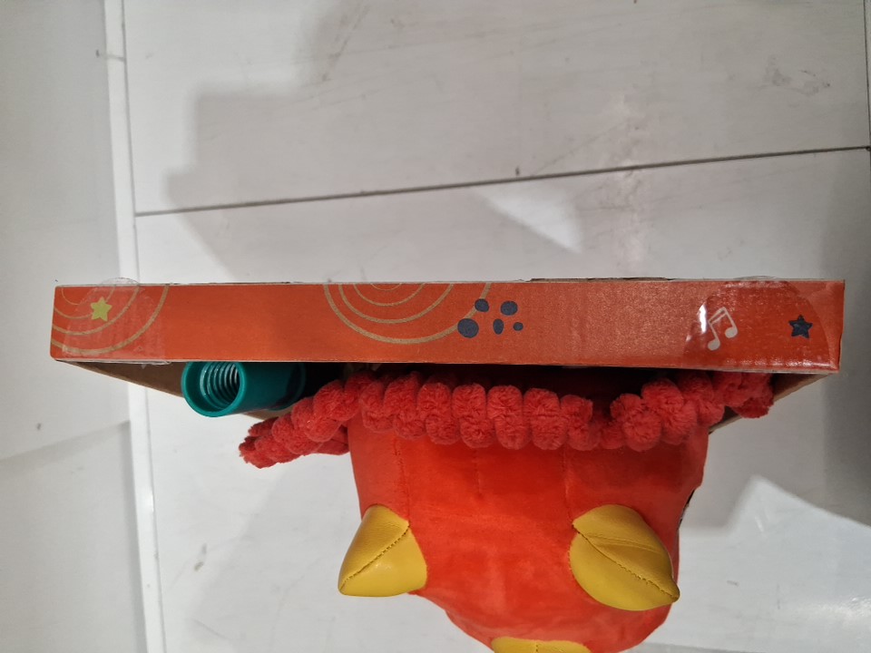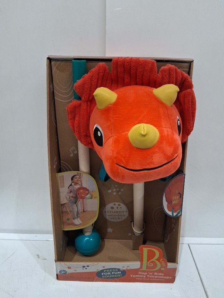 B Toys Hop 'n' Ride Tommy Triceratops Plush Dinosaur Hobbyhorse with Sounds - 35" x 9" - Red/Wood