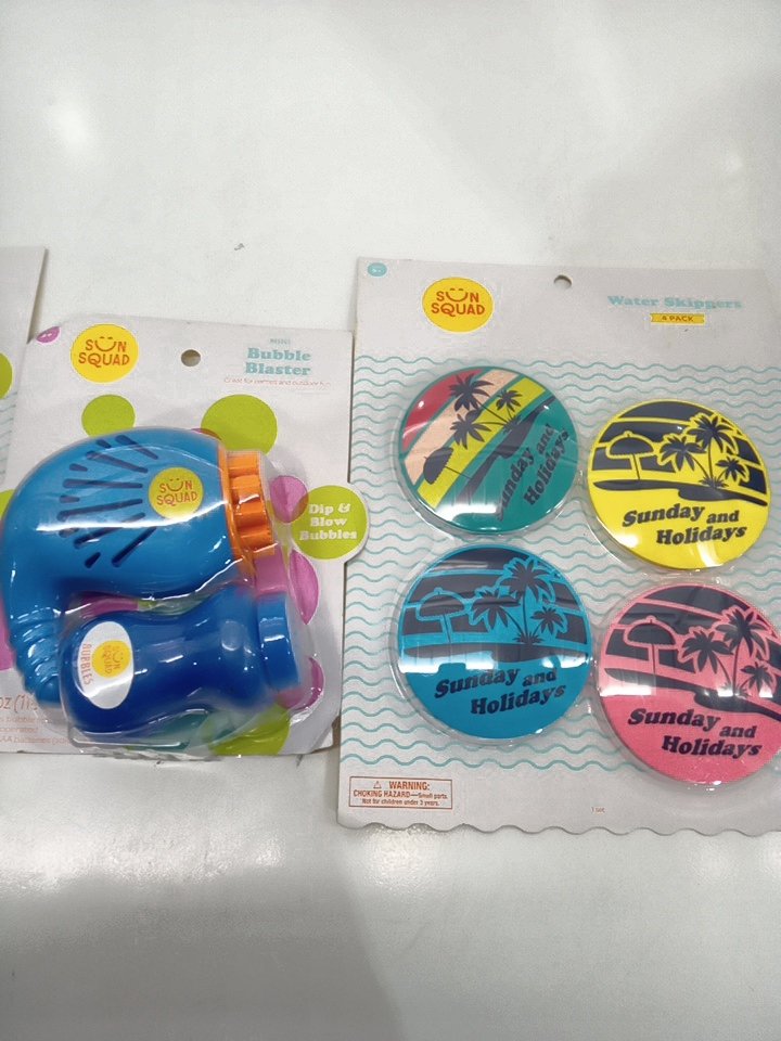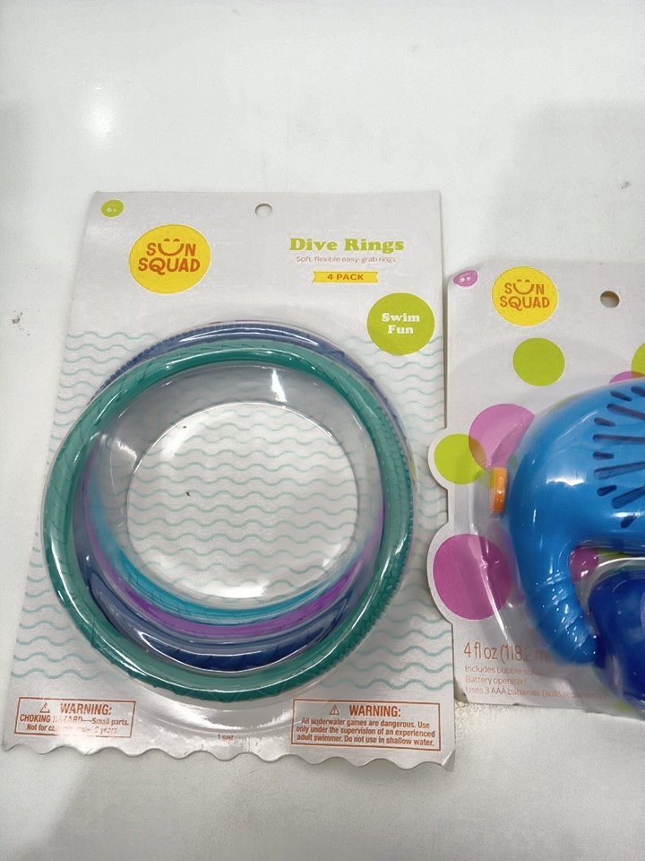 3 assorted sun squad products - dive rings/ bubble blaster/ water skippers