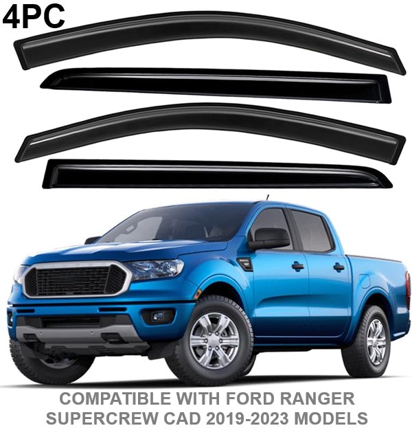 4PCS LIGHTRONIC OUTSIDE MOUNTED SIDE WINDOW DEFLECTOR VISOR/ RAIN GUARD - FOR 2019-2023 Ford Ranger SuperCrew Cab Pickup MODELS - DARK SMOKE BLACK (MODEL: WV94387)