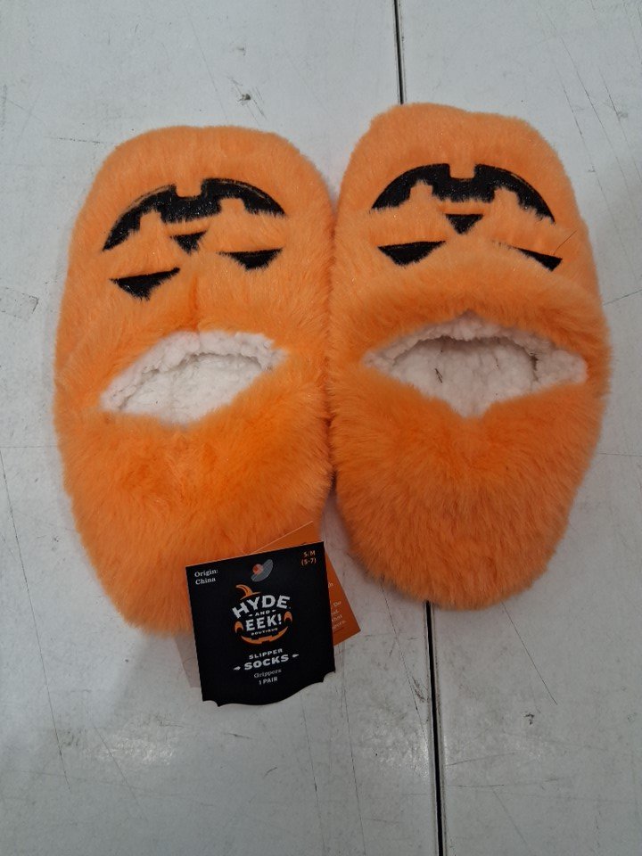 Women's Hyde and EEK! Pumpkin Embroidered Halloween Faux Fur Slipper Socks with Grippers - Size 5-7 - Orange/Black