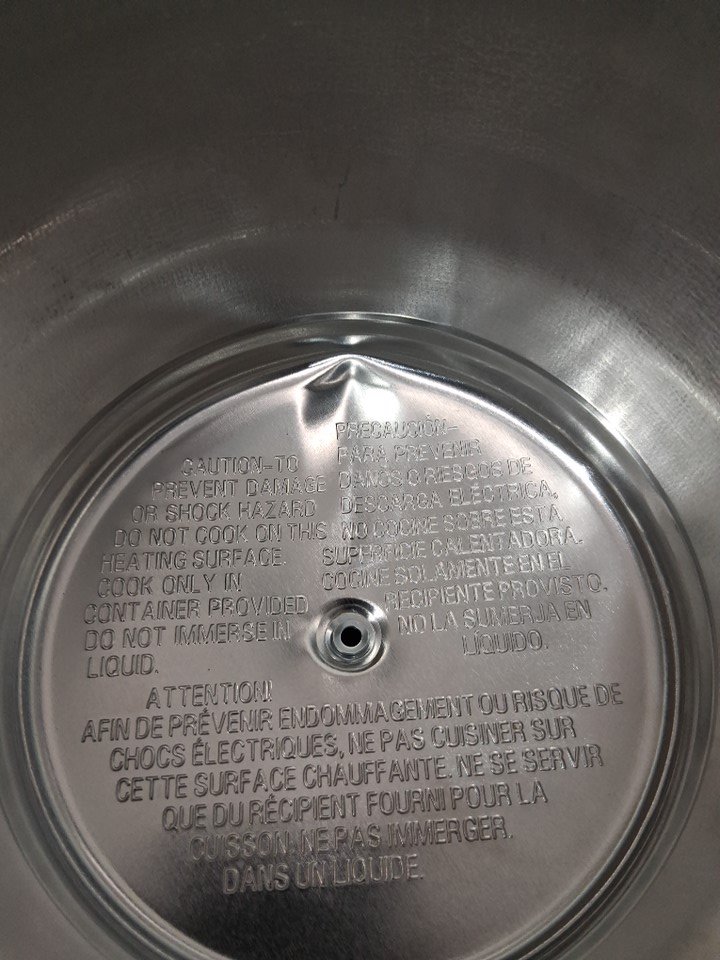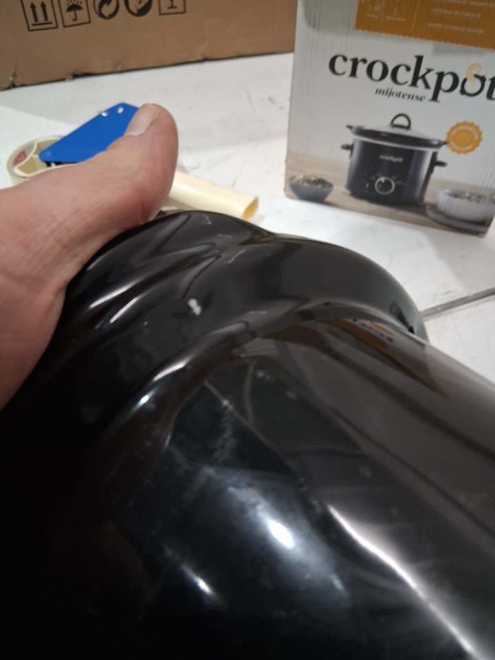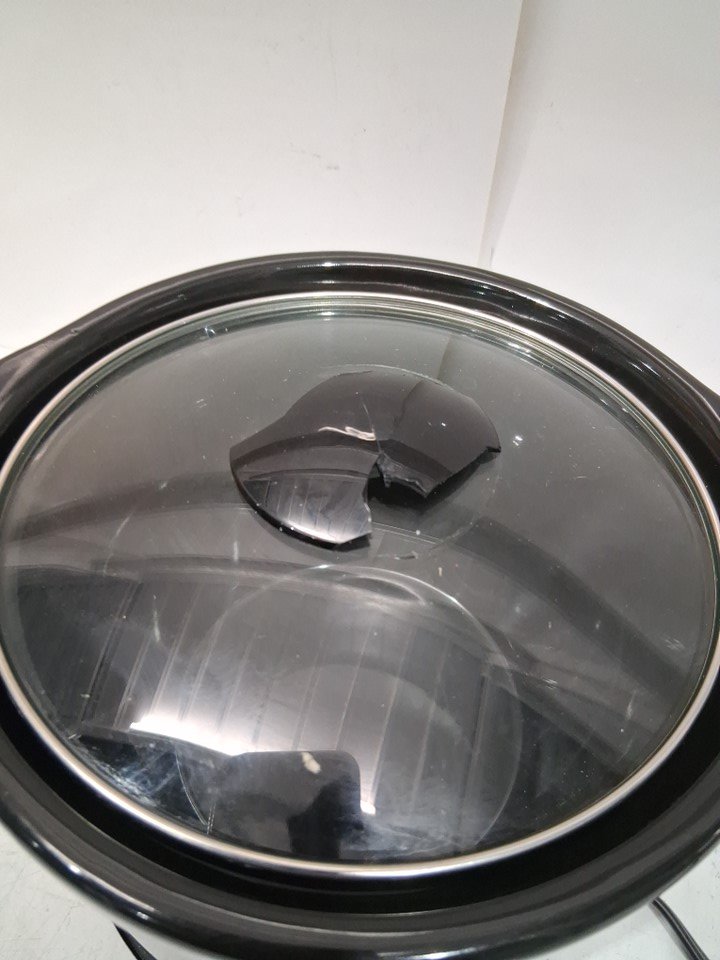 handle on lid is broken / missing, there is a dent in the bottom of the cooker and scratch marks on the pot it self, item was tested for basic power and did get hot