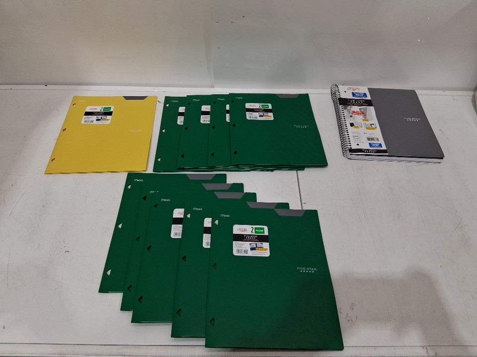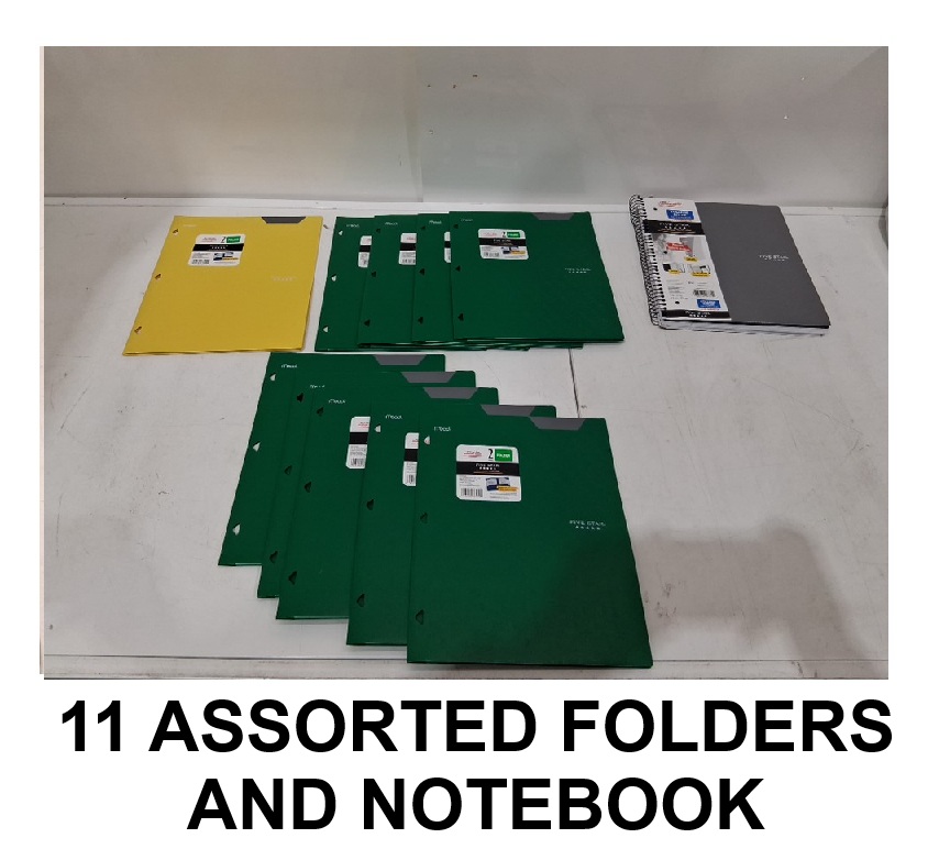 11 ASSORTED FOLDERS AND NOTEBOOK - Green/Yellow/Grey