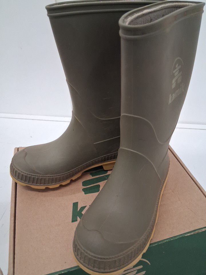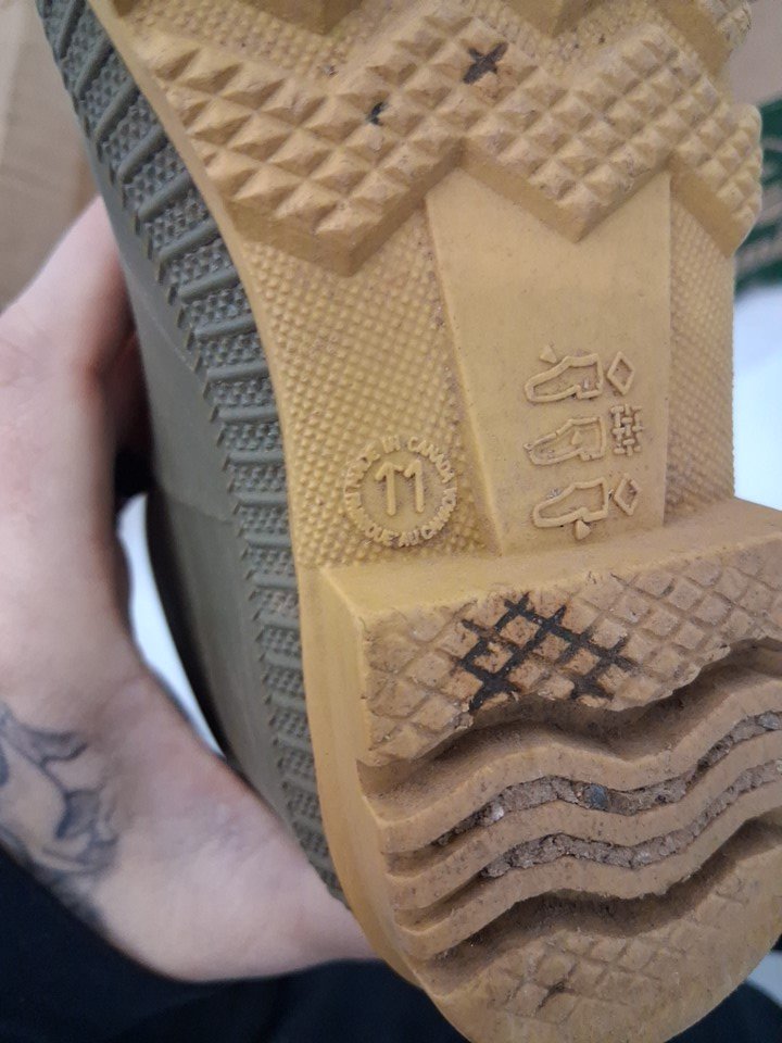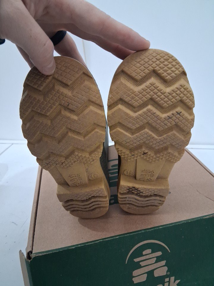 Boots have dirt discoloration on toes and scuffing on sides. Soles have visible dirt on treads