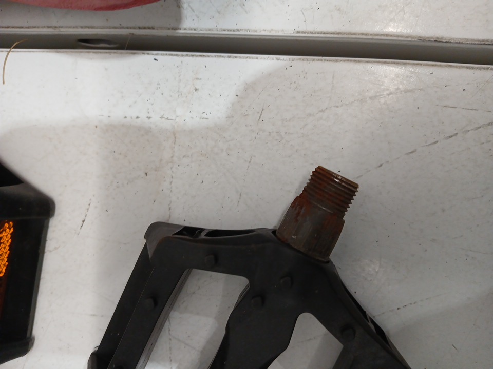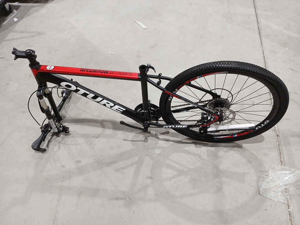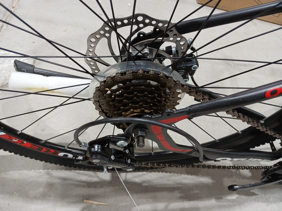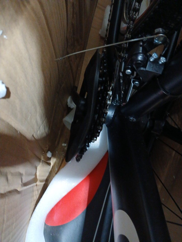the bike has some previous use signs with some rust on the wheel mount, bent chain cover and some debris from riding.