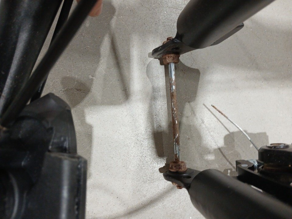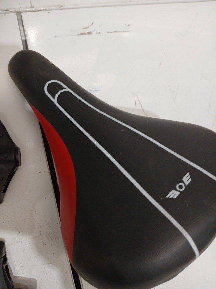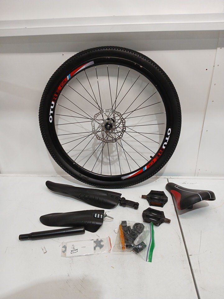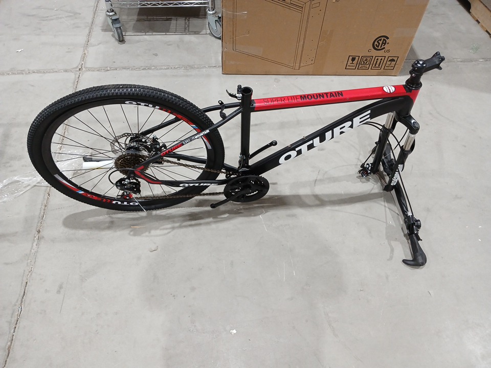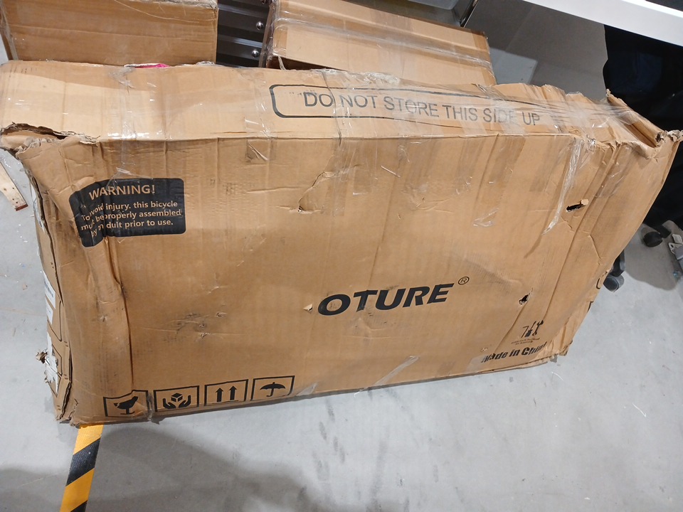 the bike has some previous use signs with some rust on the wheel mount, bent chain cover and some debris from riding.