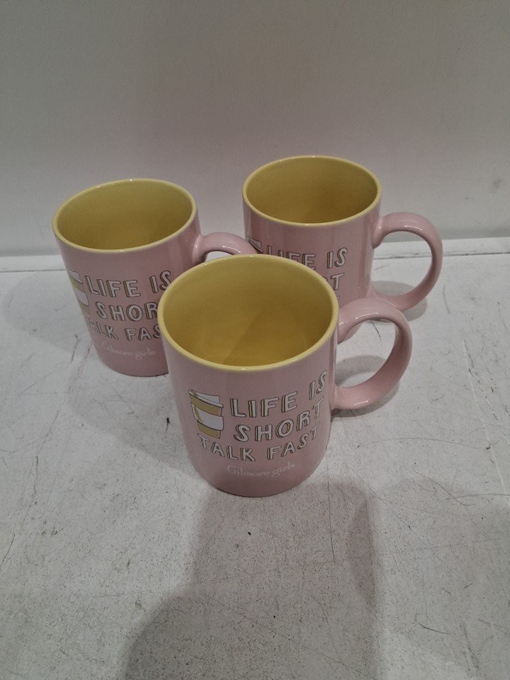 3 gilmore girls " life is short think fast " ceramic mugs - yellow /pink