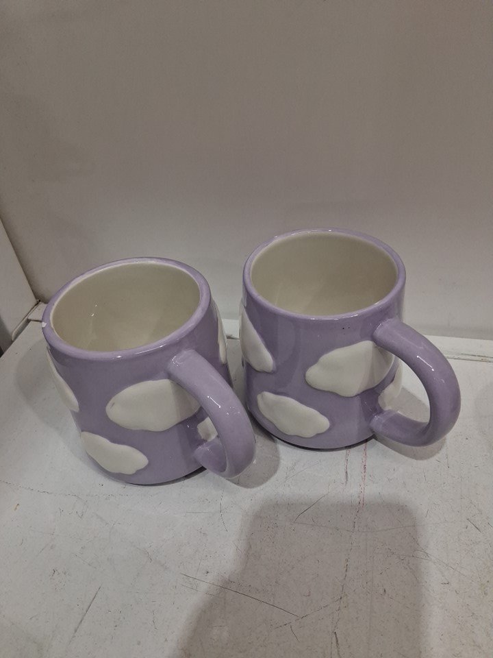 2 BULLSEYE PLAYGROUND CLOUD CERAMIC COFFEE MUGS - 11.8OZ - purple /white