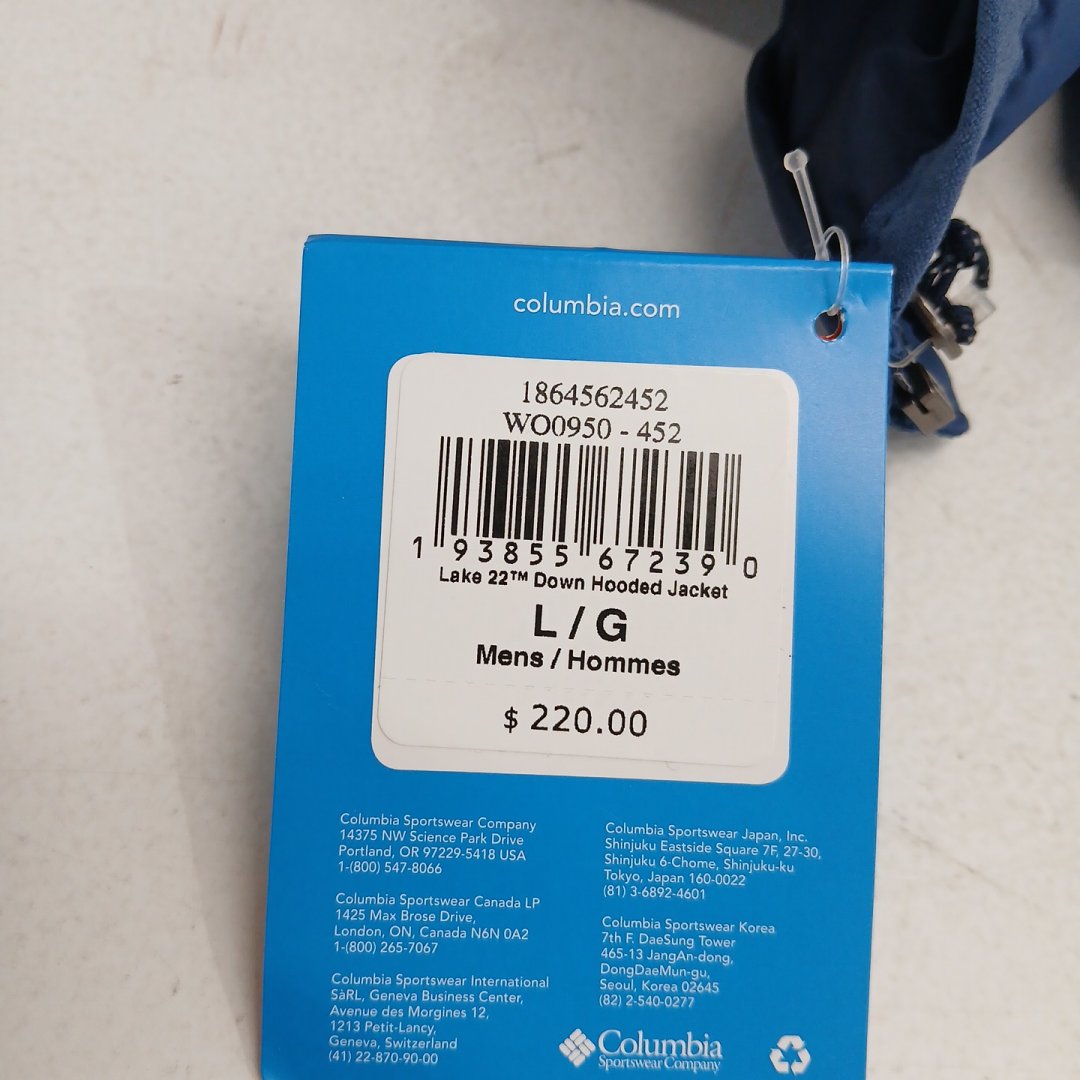 MEN'S COLUMBIA LAKE 22 DOWN HOODED JACKET - LARGE - BLUE (MODEL: WO0950-452)