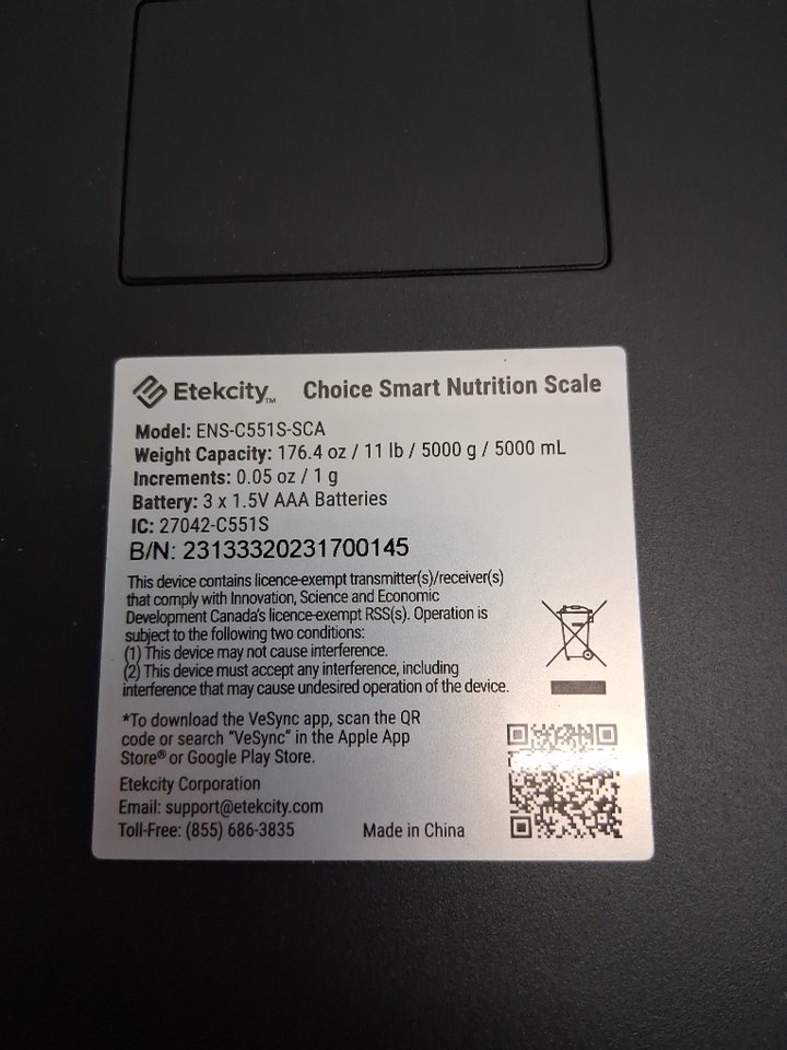 Etekcity Choice Smart Food Nutrition Scale - Silver (Model: ENS-C551S-SCA)