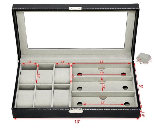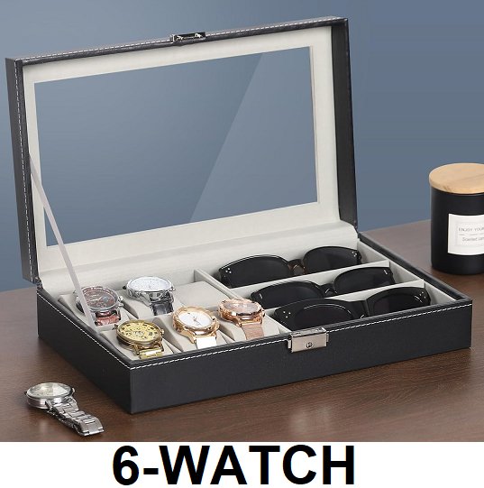 Autoark Leather 6-Watch Box Jewelry Case and 3 Eyeglasses Storage Display Case Organizer, Black (MODEL: AW-004)
