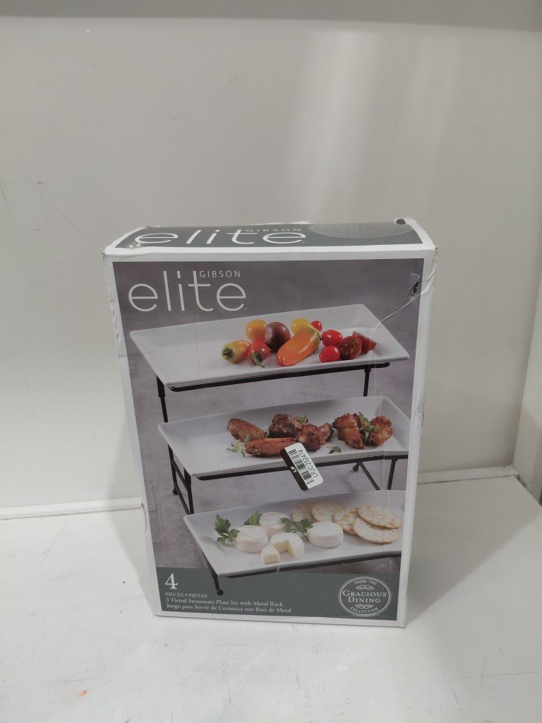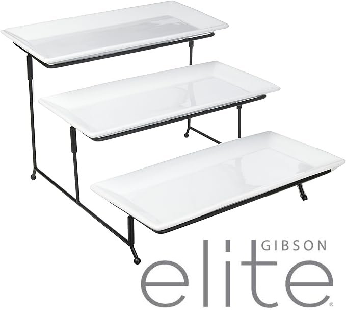 gibson elite 3 tiered stoneware plate set with rack - white/black