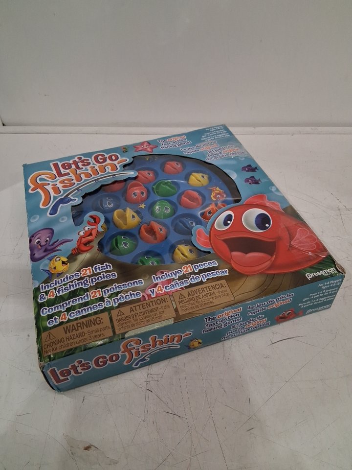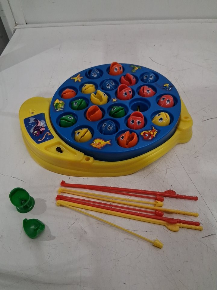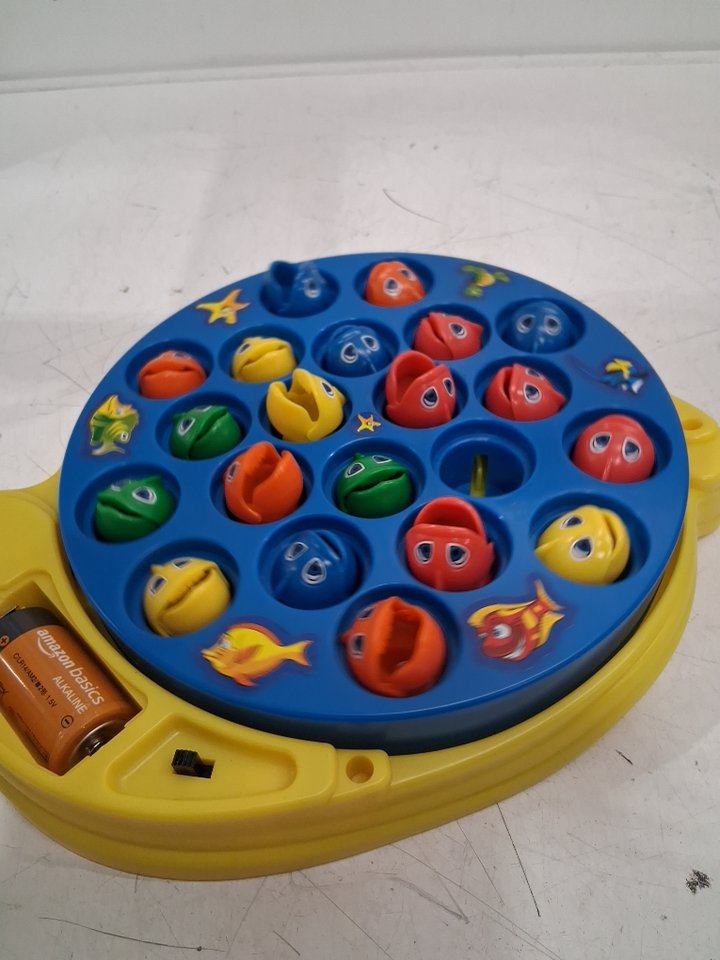 Tested for motor functionality. Please note: • The game showed signs of previous use with a dead battery already being inserted. • One of the green fish's jaw pegs is broken so the mouth does not stay attached, see photos.