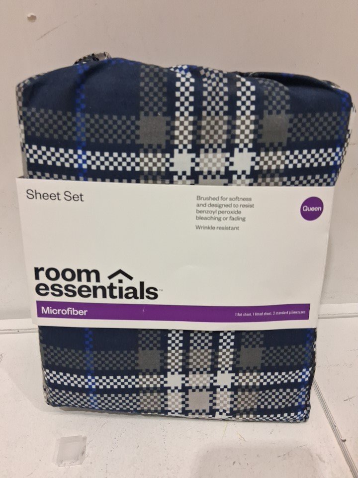 4PC room essentials microfiber sheet set - QUEEN - blue plaid