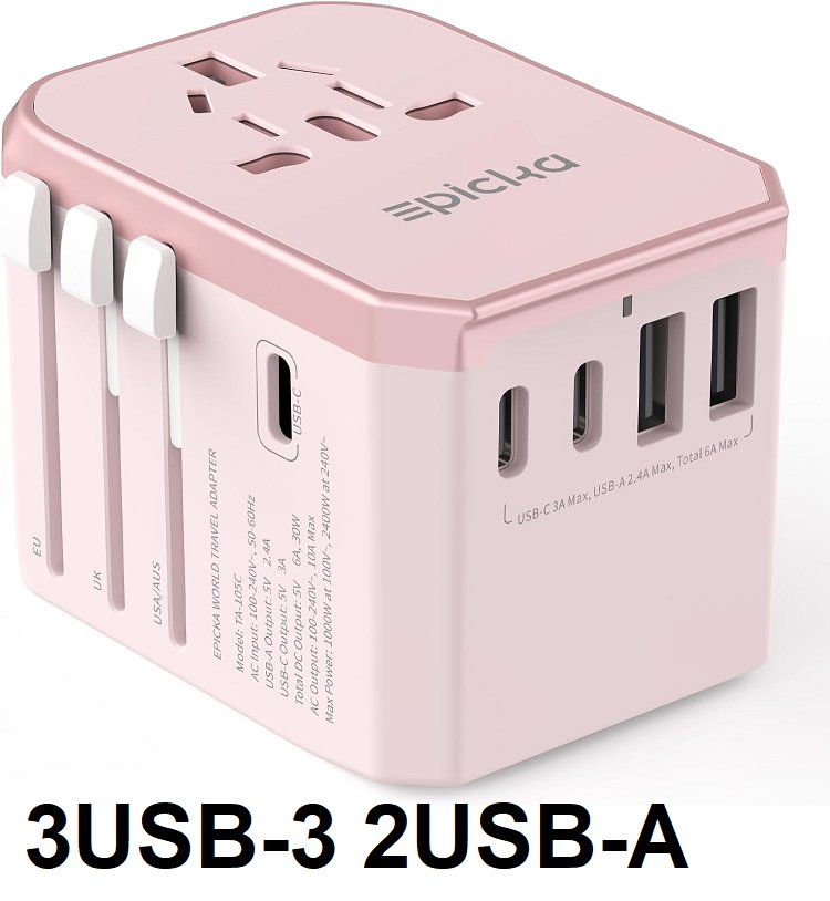 EPICKA Universal Travel Adapter, International Power Plug Adapter with 3 USB-C and 2 USB-A Ports, All-in-One Worldwide Wall Charger - pink - (model:ta-105c)