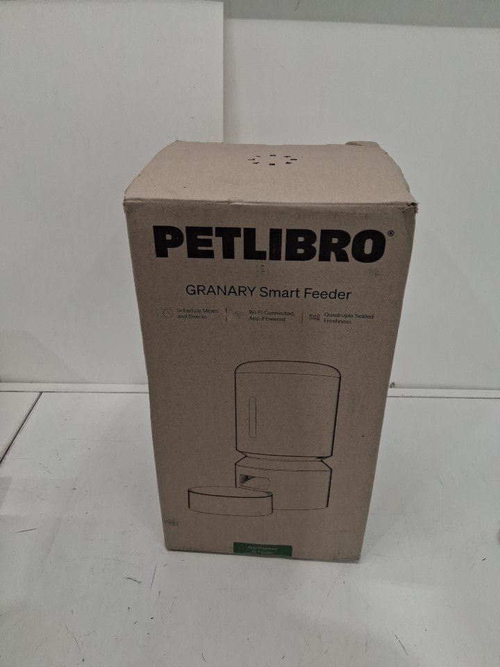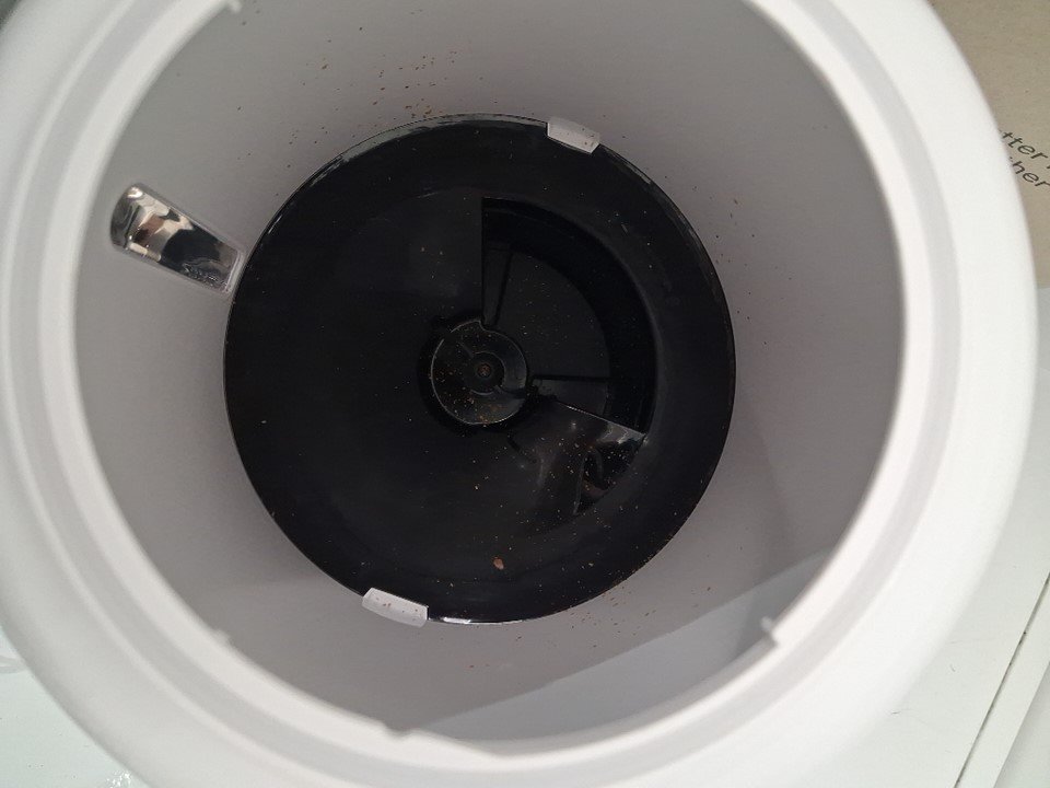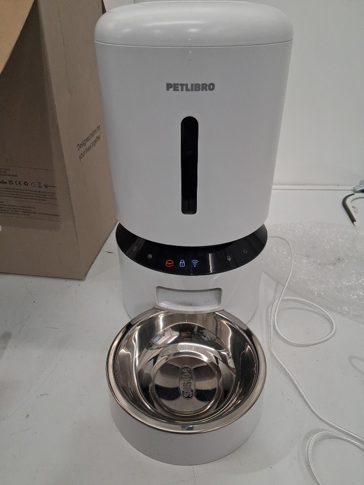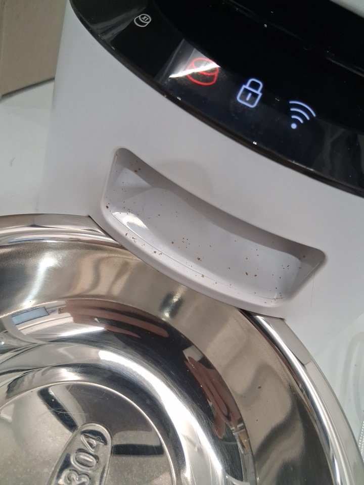 smart feeder has food kibble crumbs inside and in dispenser spout. has been tested for power