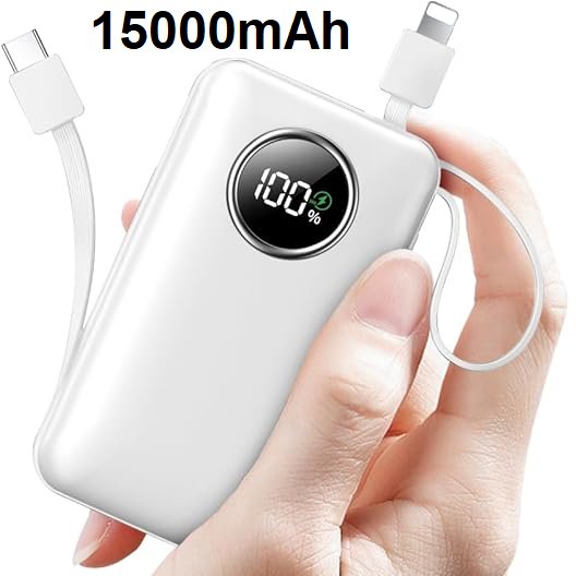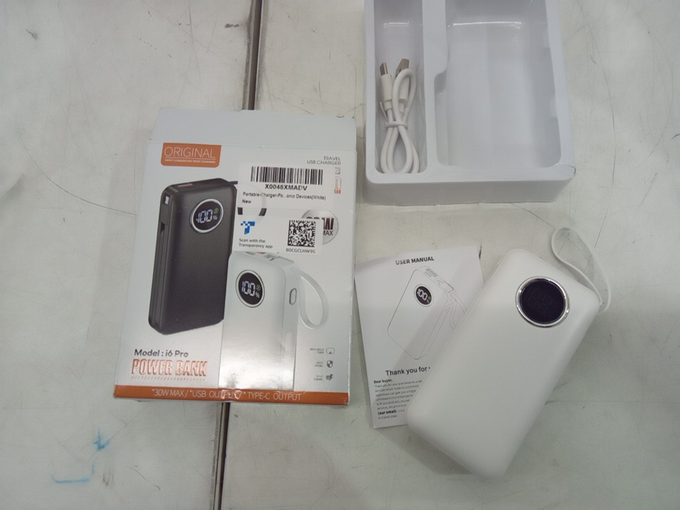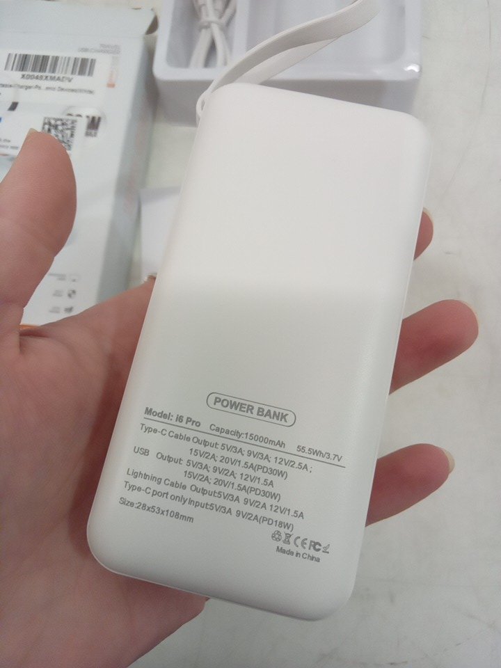 portable power bank with built-in Type-C cable and USB port - white - (model: i6 pro)