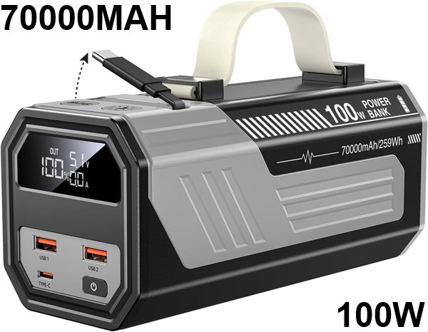 CUZAR Laptop Power Bank Portable Charger with 100W USB-C Ports and Retractable Cable -100W 70000mAh - GREY/BLACK (MODEL: MCB)