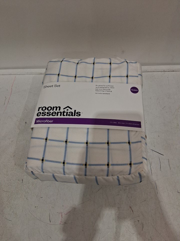3pc room essentials microfiber sheet set - flat sheet, fitted sheet, pillow case - QUEEN - BLUE GRID