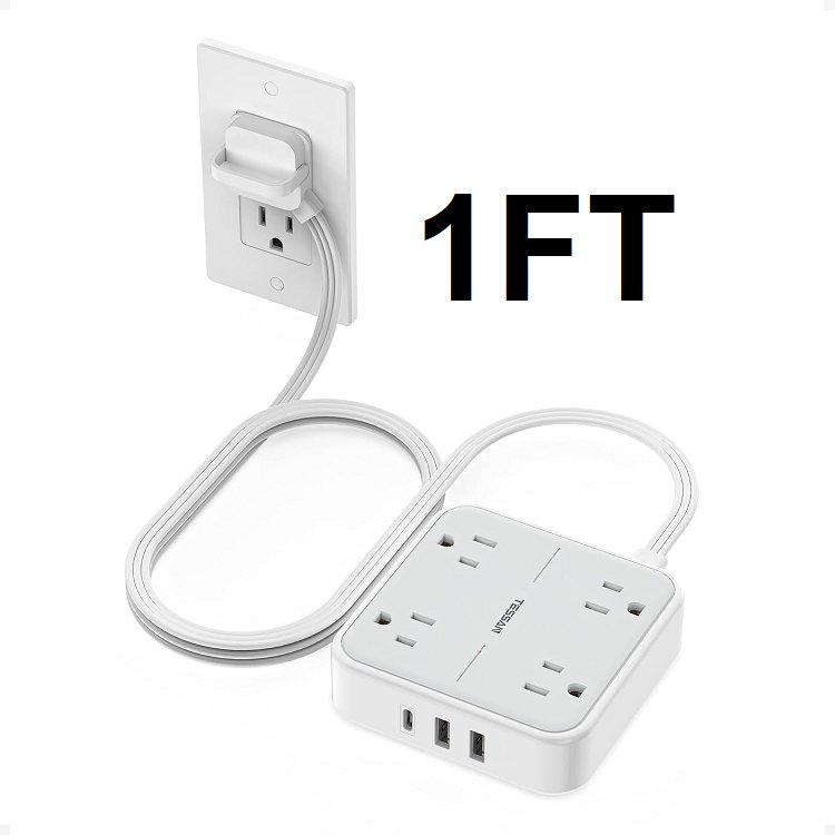 TESSAN Flat Plug Power Bar Surge Protector Power Strip Ring Pull with 3 USB (1 USB C) 4 Outlets, - 1ft - white