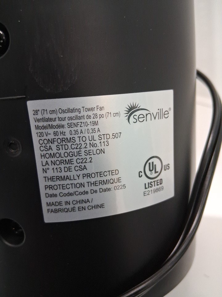 SENVILLE OSCILLATING TOWER FAN - 3-SPEED, 60° OSCILLATION - 28" - BLACK (MODEL: SENFZ10-19M)