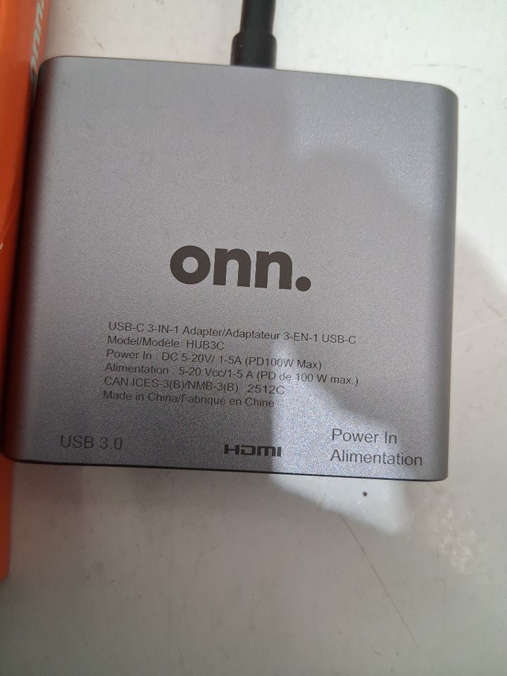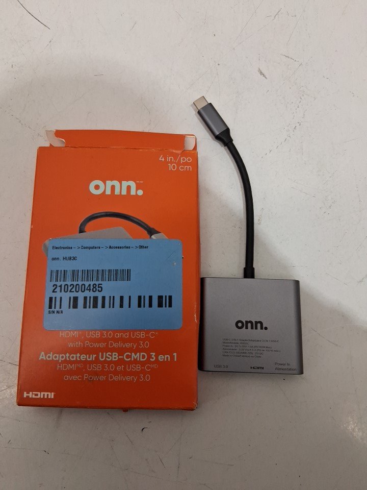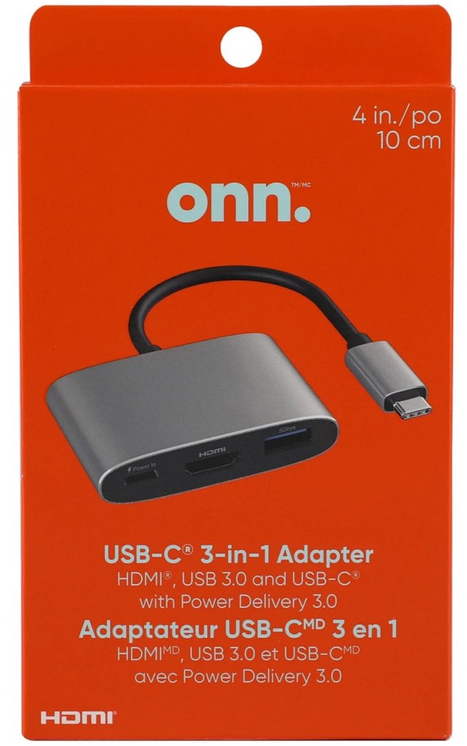 Onn. USB-C, HDMI, USB 3.0 3-in-1 Adapter with Power Delivery 3.0 - 4" CABLE - GREY
