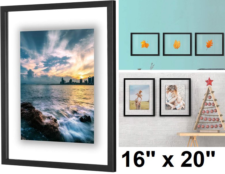 nfw double glass sided floating picture frame for walls - 16" x 20" - black