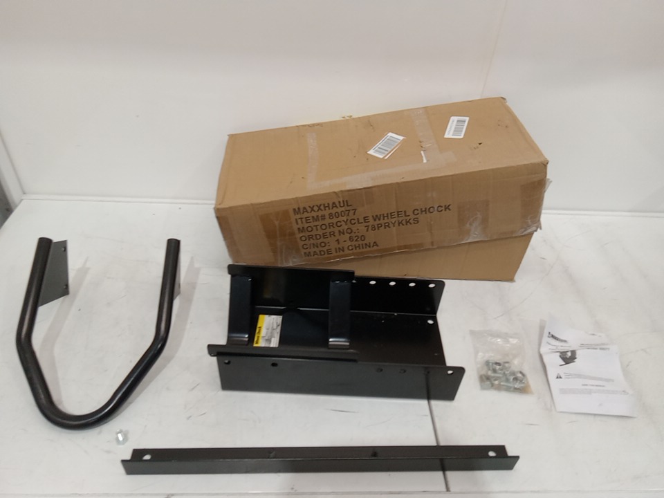 maxxhaul standard motorcycle wheel chock with pivoting cradle - fits bike tires 14" - 21" - black - (model: 80077)