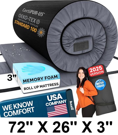hazli matrix cell roll up memory foam camping mattress pad - 72'' x 26'' x 3'' - grey