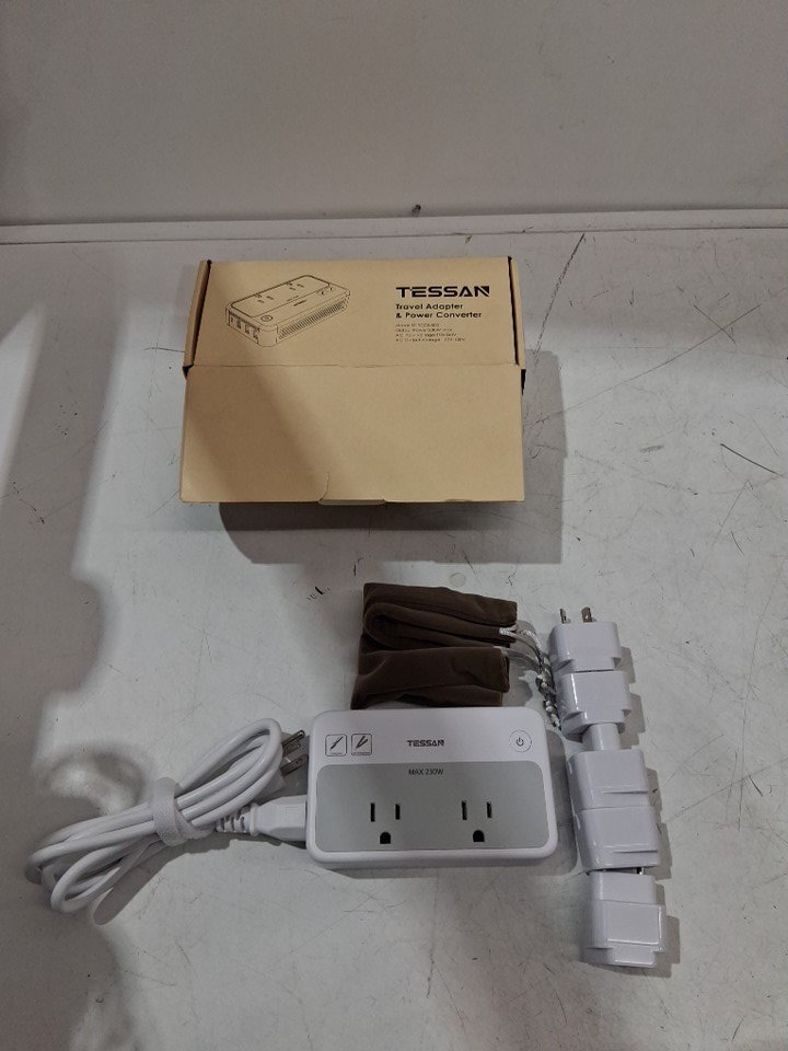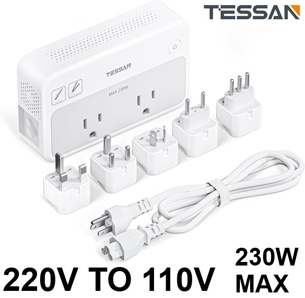 TESSAN Universal Travel Power Adapter Combo with International Plug (Type C/G/D/I/L), 2AC 4 USB Ports (1 USBC), 230W Max Step Down Transformer for US to Europe - WHITE (MODEL: TS-TC02US00)
