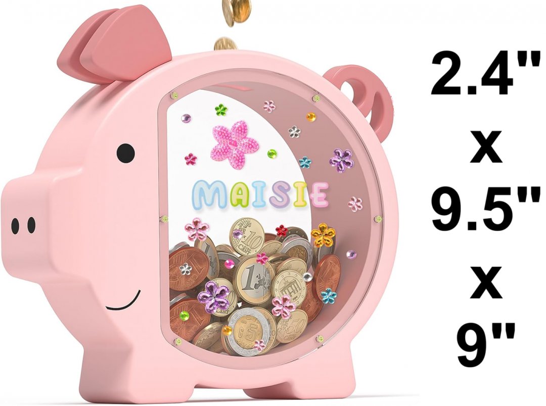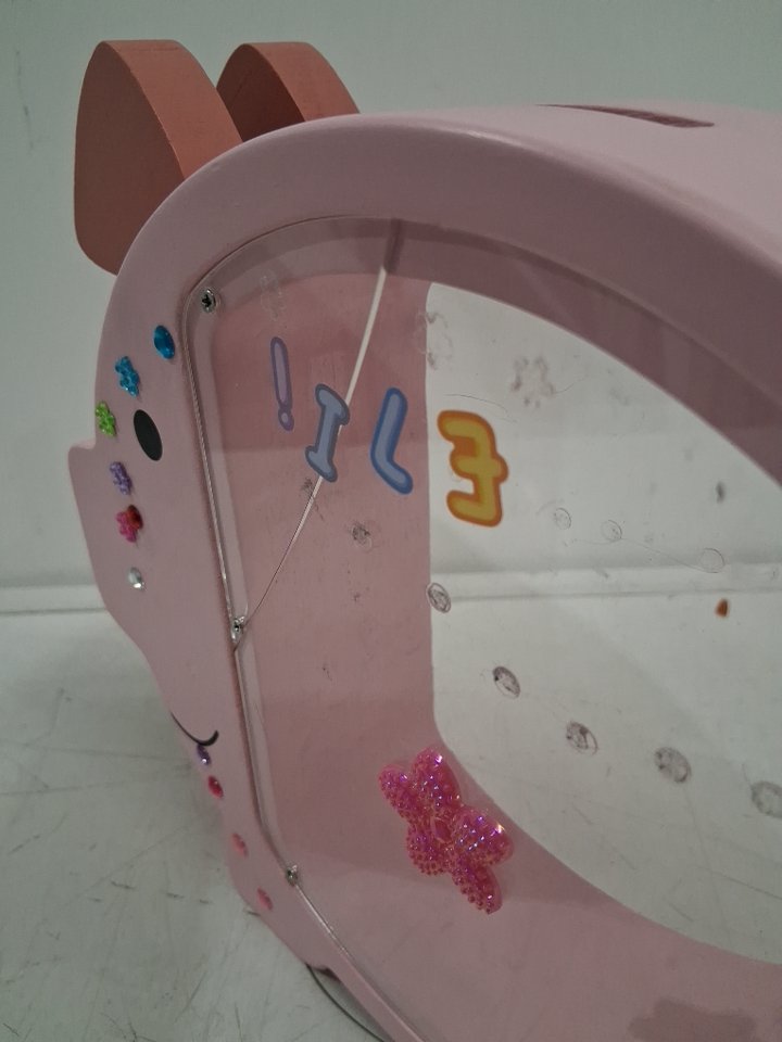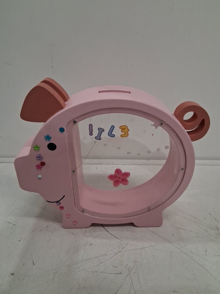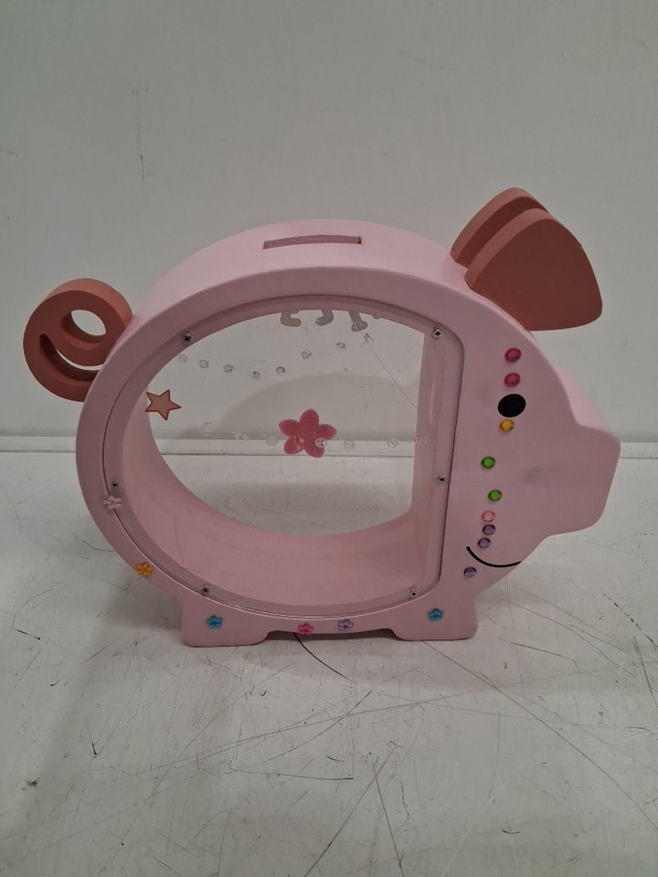 Please note the piggy bank shows signs of previous use with stickers on the side and a crack in the window, see photos.