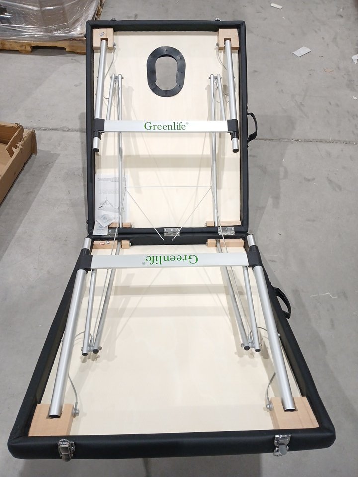 This item has a long tear on one side of the fabric of the table and is a little dirty from the warehouse
