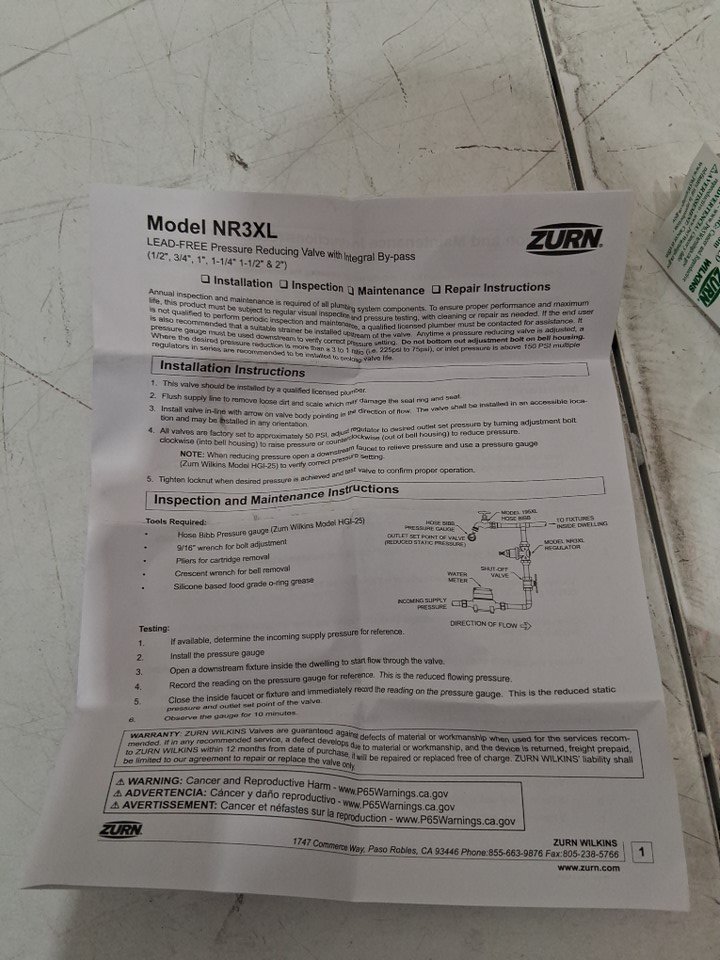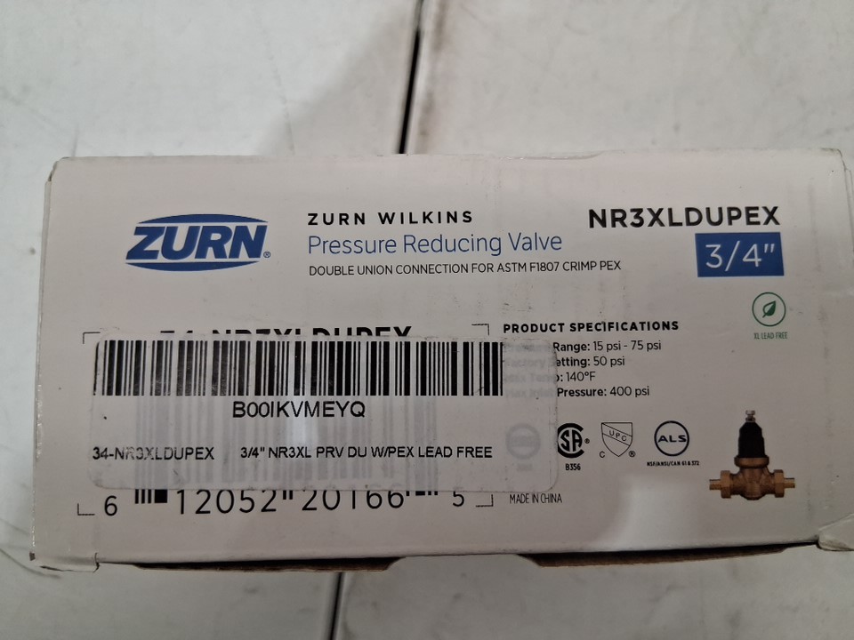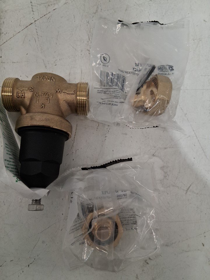 Zurn Wilkins 3/4" Pressure Reducing Valve with double union FNPT connection and a male barbed connection PEX tailpiece (MODEL:NR3XLDU)