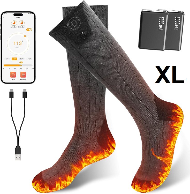Electric Heated Thermal Socks with app control and 2 batteries - extra large (us shoe size 10-14) - 8000mAh - 4 heat levels - black (model: ‎kec-8000)