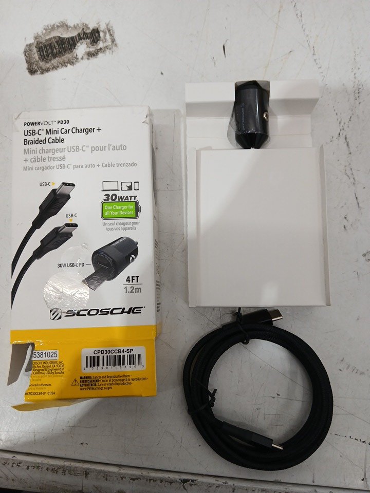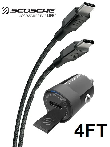 scosche powervolt PD30 usb-c mini car charger and braided cable - 4ft - black (model: cpd0ccb4-sp)