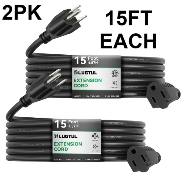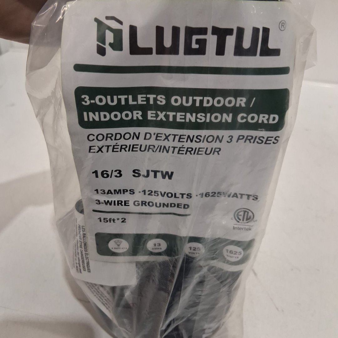 2PK PLUGTUL heavy duty 3-outlets Outdoor Extension Cord - 15FT EACH - BLACK (MODEL: ‎P3+SJTW)
