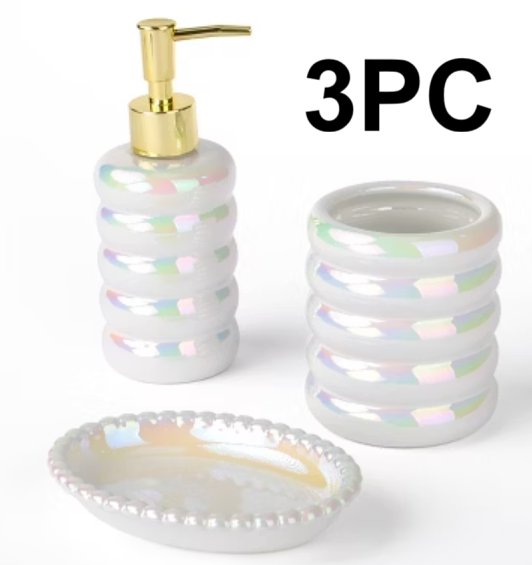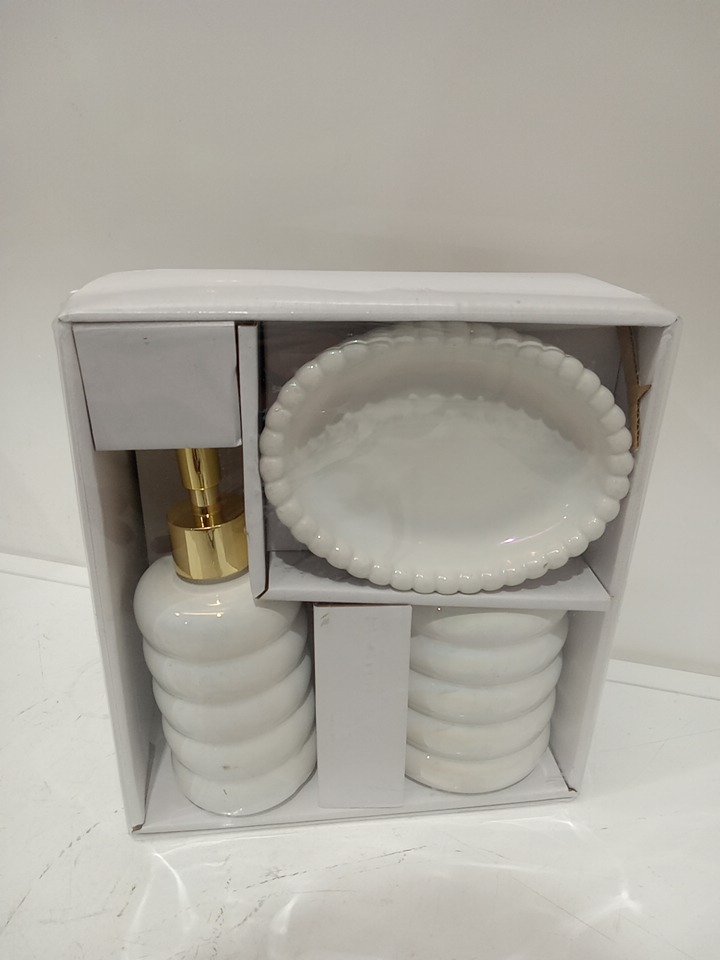 3PC CERAMIC BATHROOM SET, INCLUDES SOAP DISPENSER, TOOTHBRUSH HOLDER, SOAP DISH - WHITE