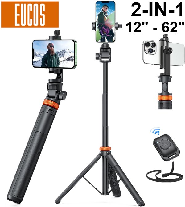 Eucos 2-in-1 Tripod Stand and Selfie Stick with Remote Shutter - 12 "- 62" - black (MODEL: EUTP-010)