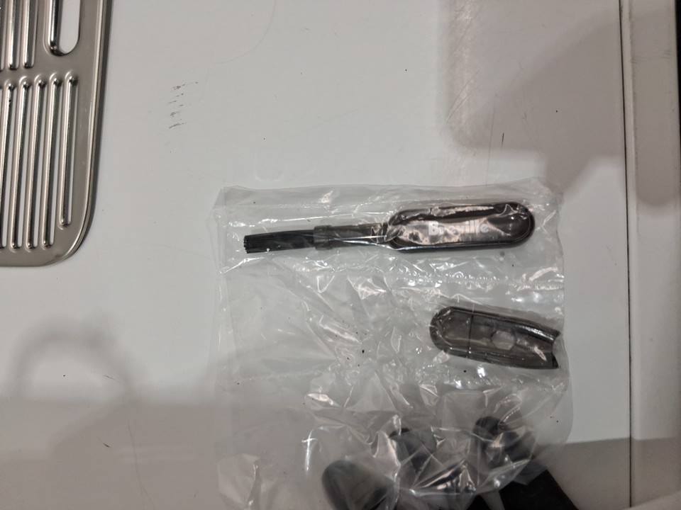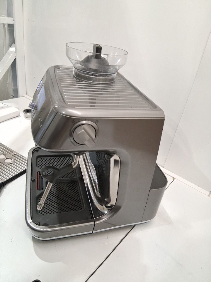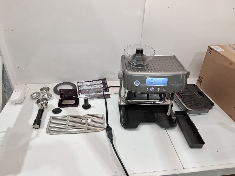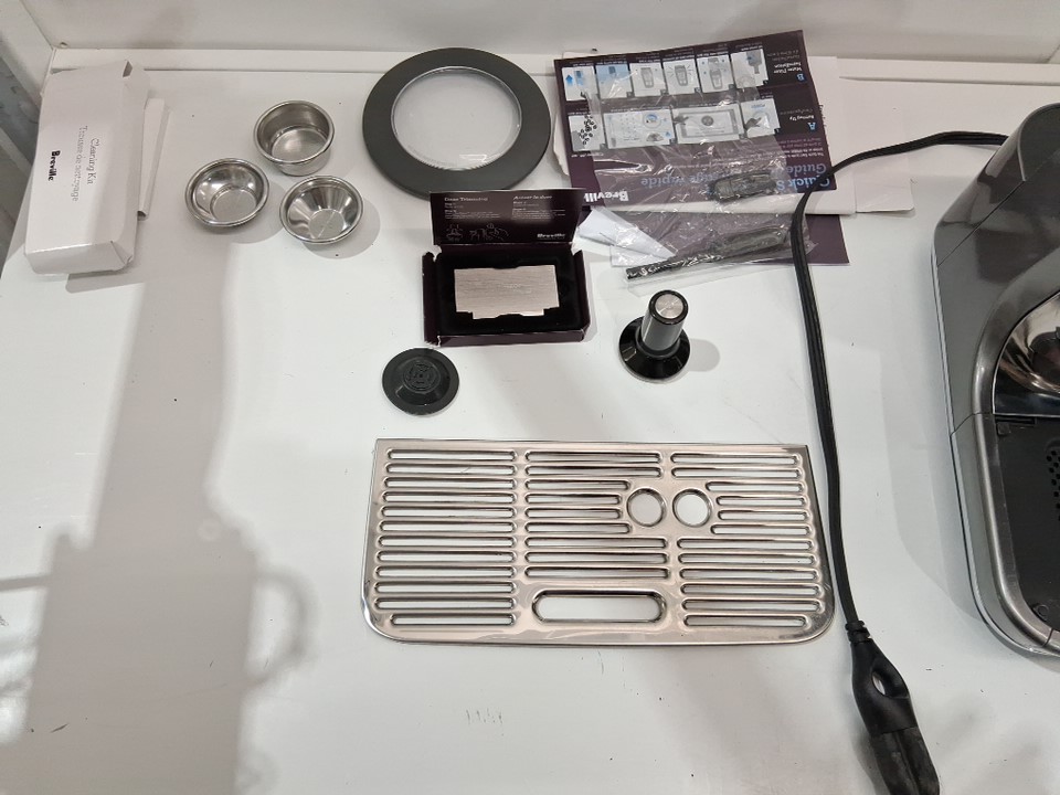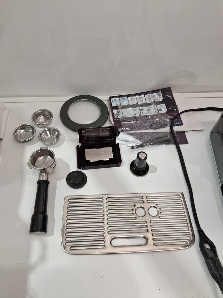 Ground coffee leftover in the grinder and dried water in the drip tray Milk jug is missing as is the water tank and filter Missing parts can be purchased from retail website: https://www.breville.com/en-us/shop/espresso/parts/BES878 Tested for power only