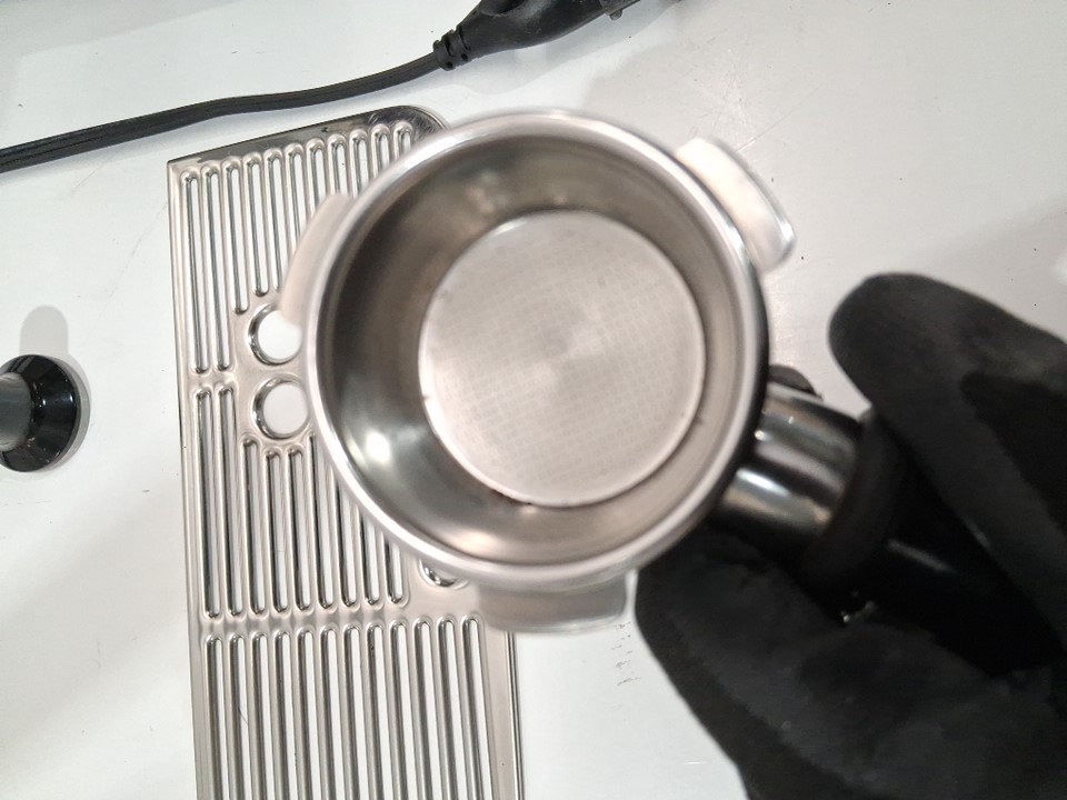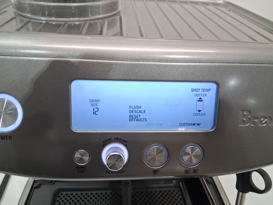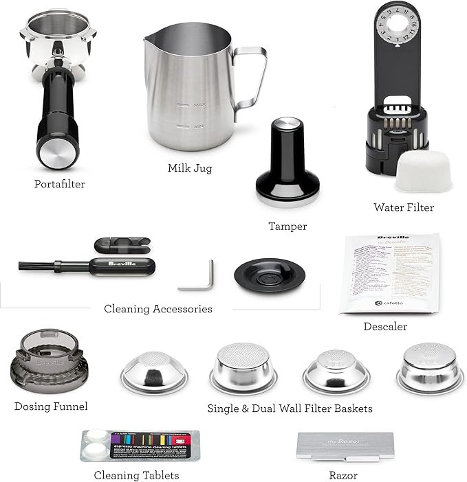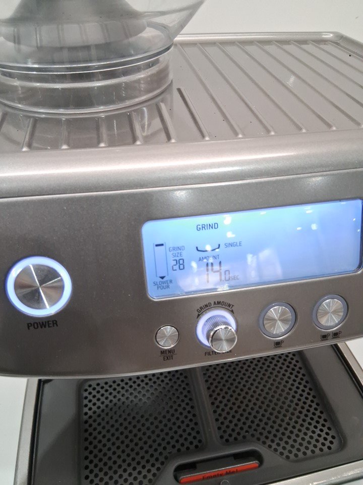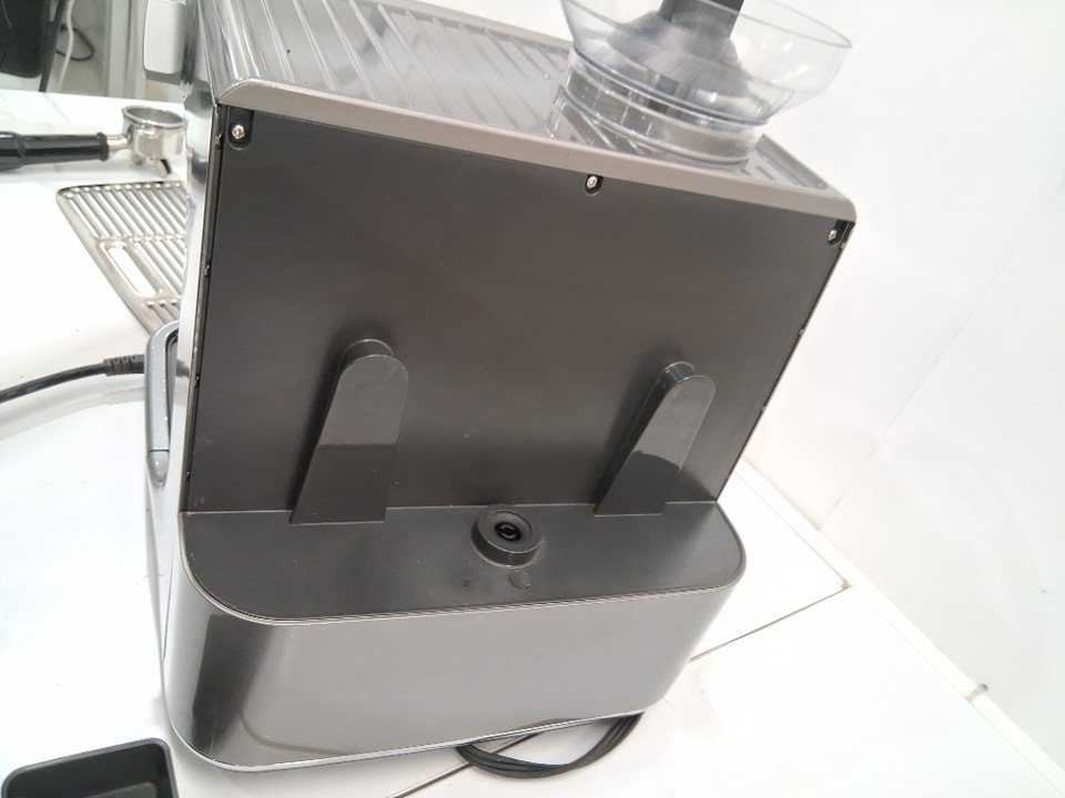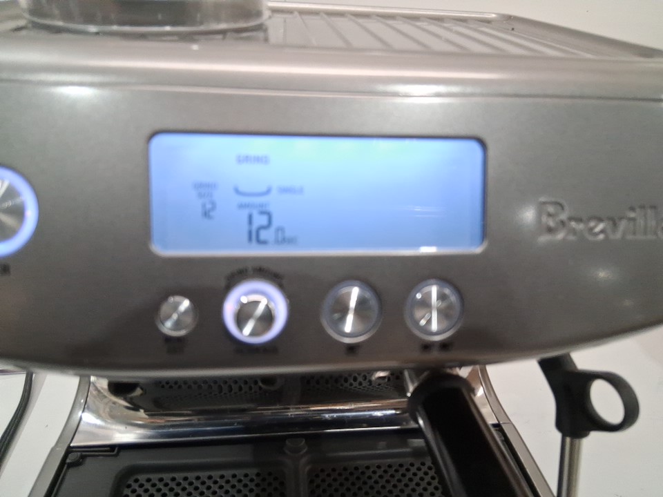 Ground coffee leftover in the grinder and dried water in the drip tray Milk jug is missing as is the water tank and filter Missing parts can be purchased from retail website: https://www.breville.com/en-us/shop/espresso/parts/BES878 Tested for power only