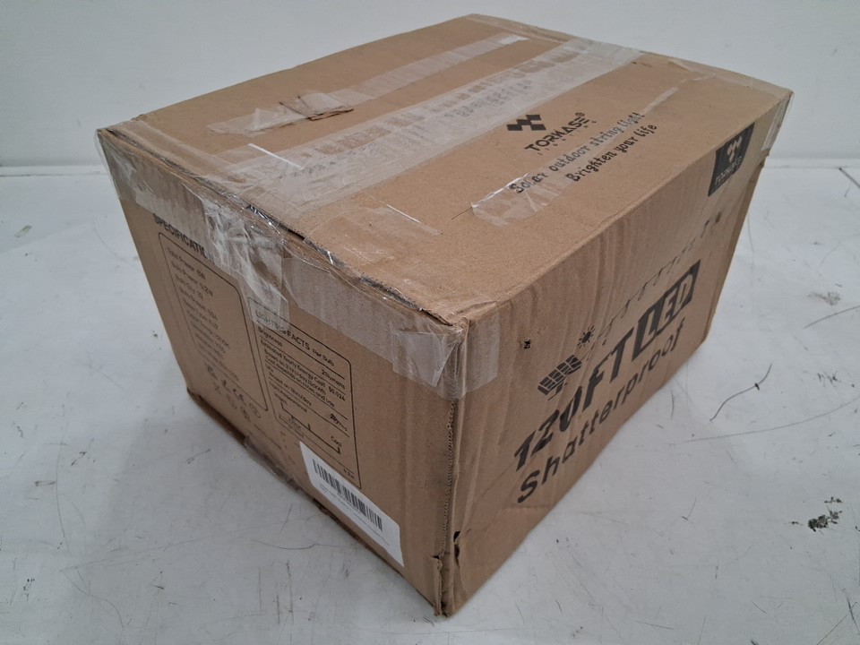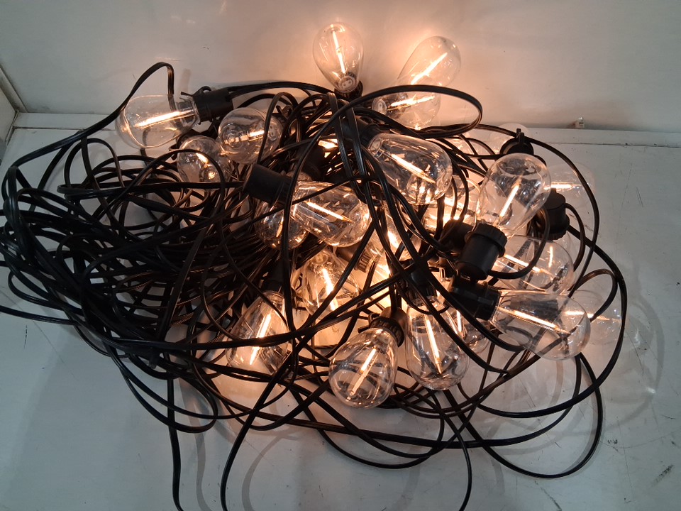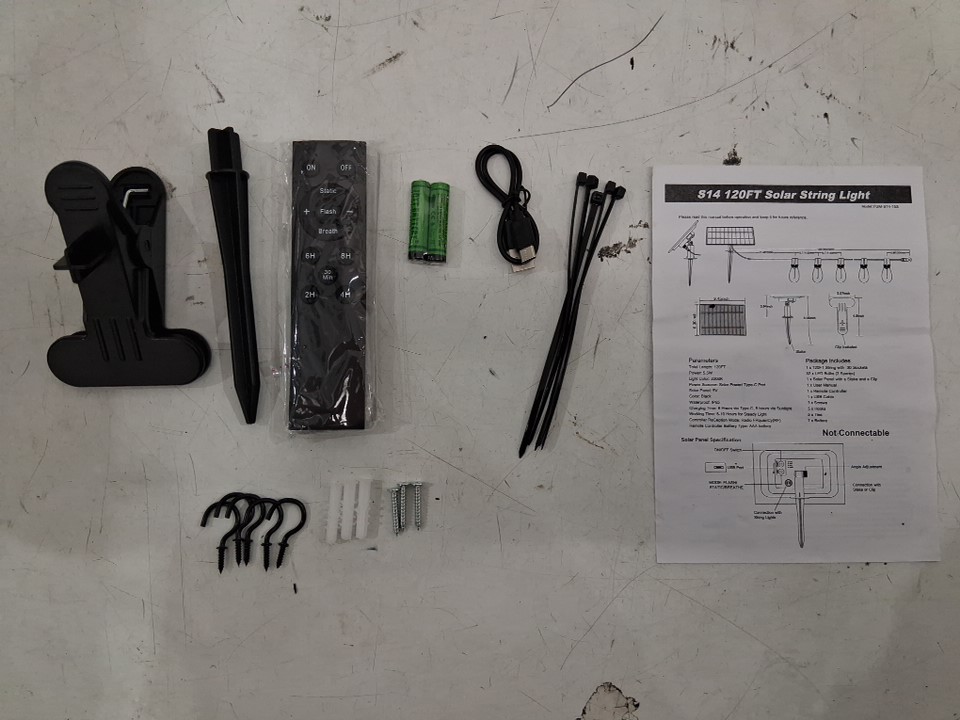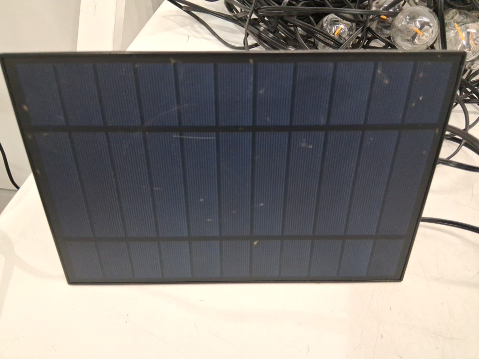 Lights shoved back into packaging in tangle. Solar panel has light aesthetic markings likely caused by packaging. (See photos)