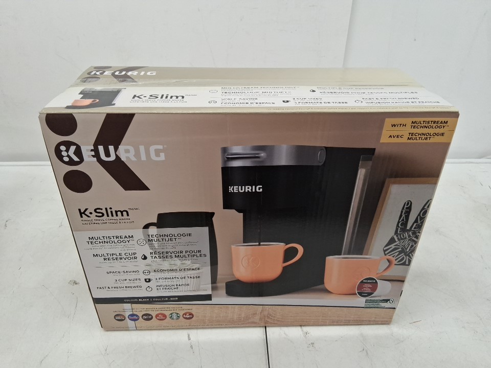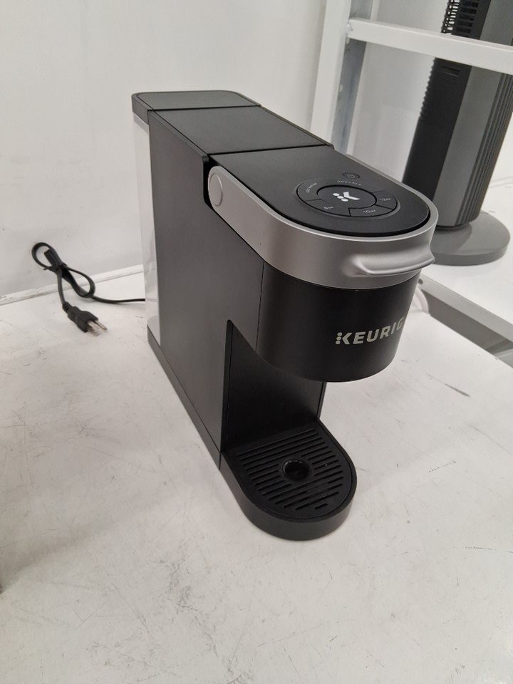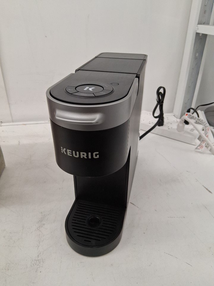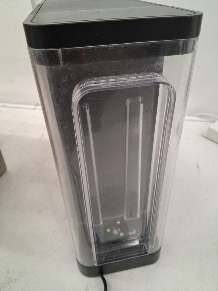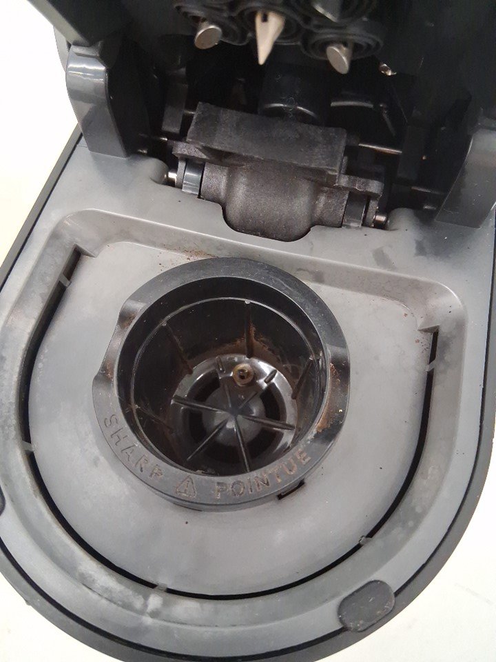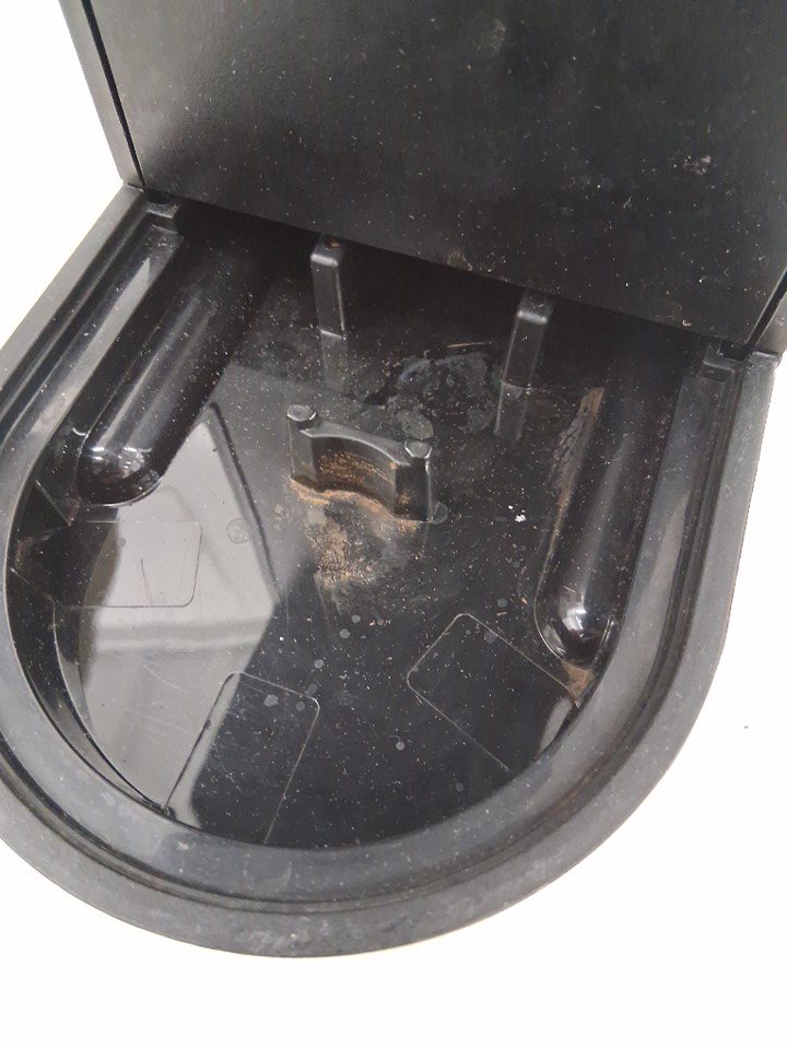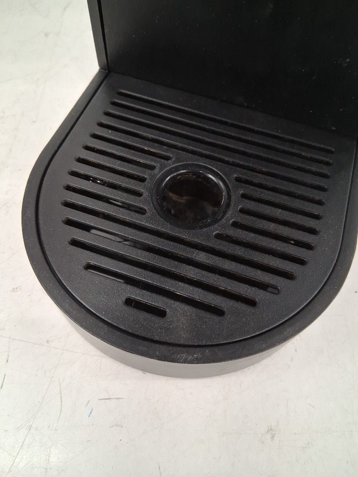 Does not power on when plugged in, indicating an internal issue. There are also some coffee stains and moisture residue indicating some previous use, but there is no apparent damage to the exterior of the machine - see photos.