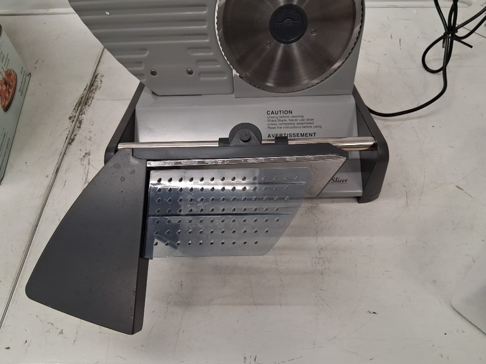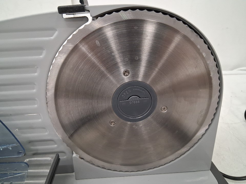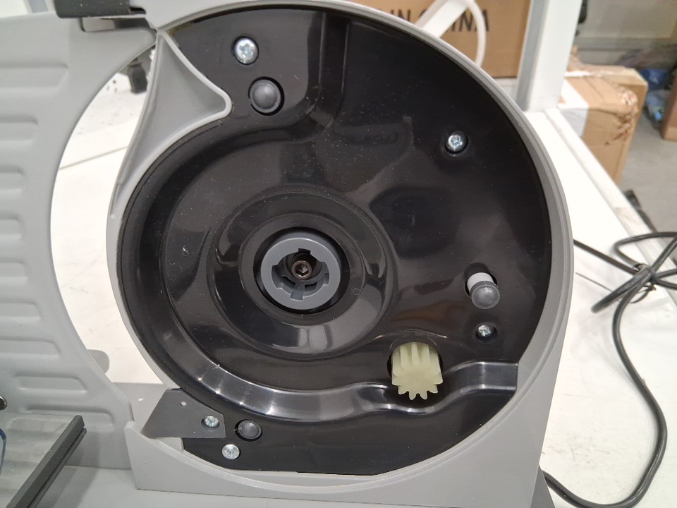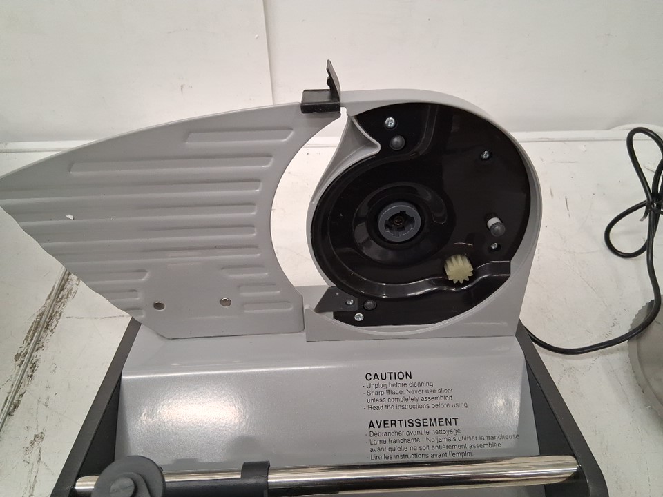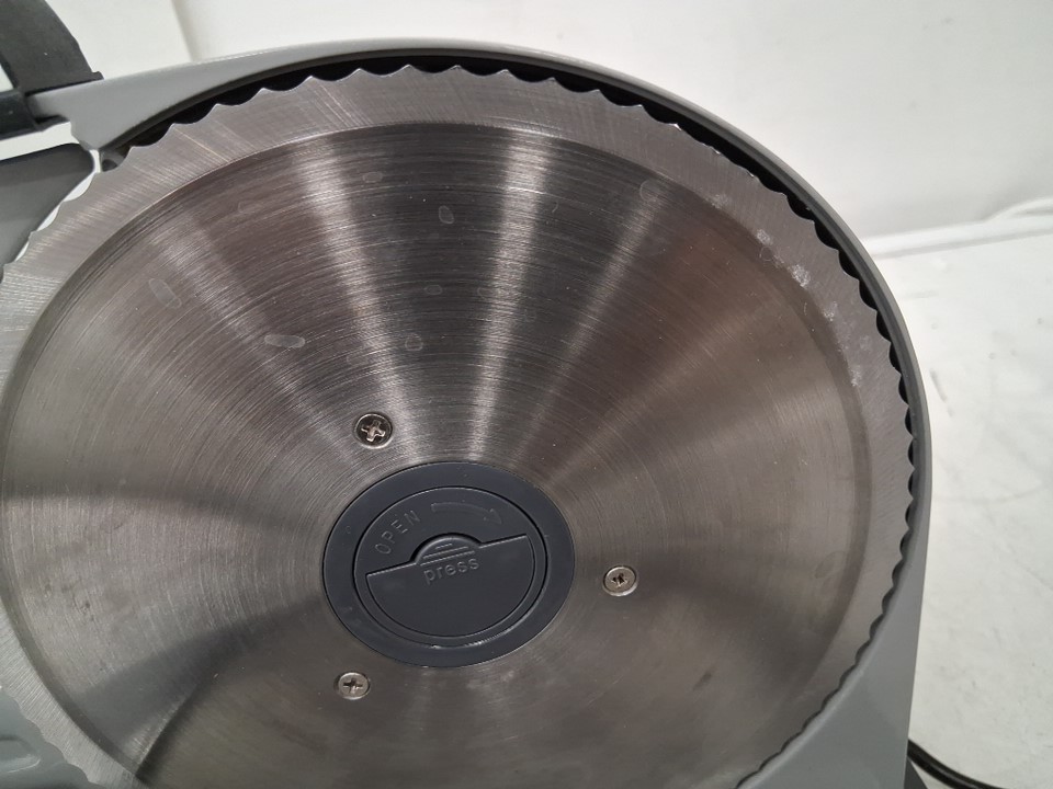 Power is functional, but the rotation system appears to be getting caught on something internally, preventing the blade from spinning. Could potentially be restored to proper function by opening the machine and unblocking whatever is getting stuck. There are also some smudges and light stains on the blade and cutting surface implying some previous use, but the machine appears in good condition overall - see photos