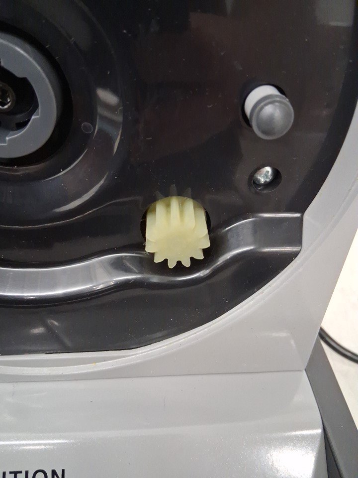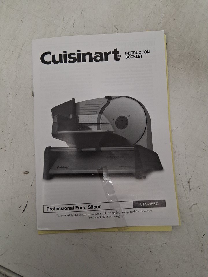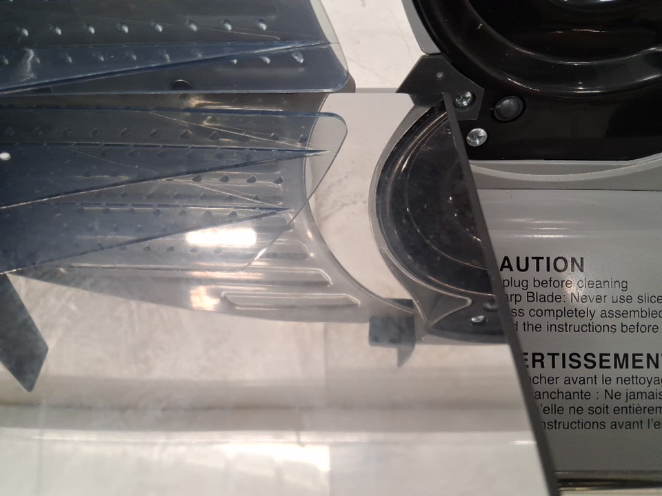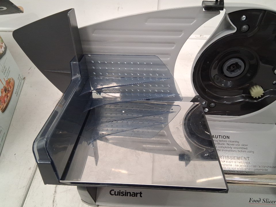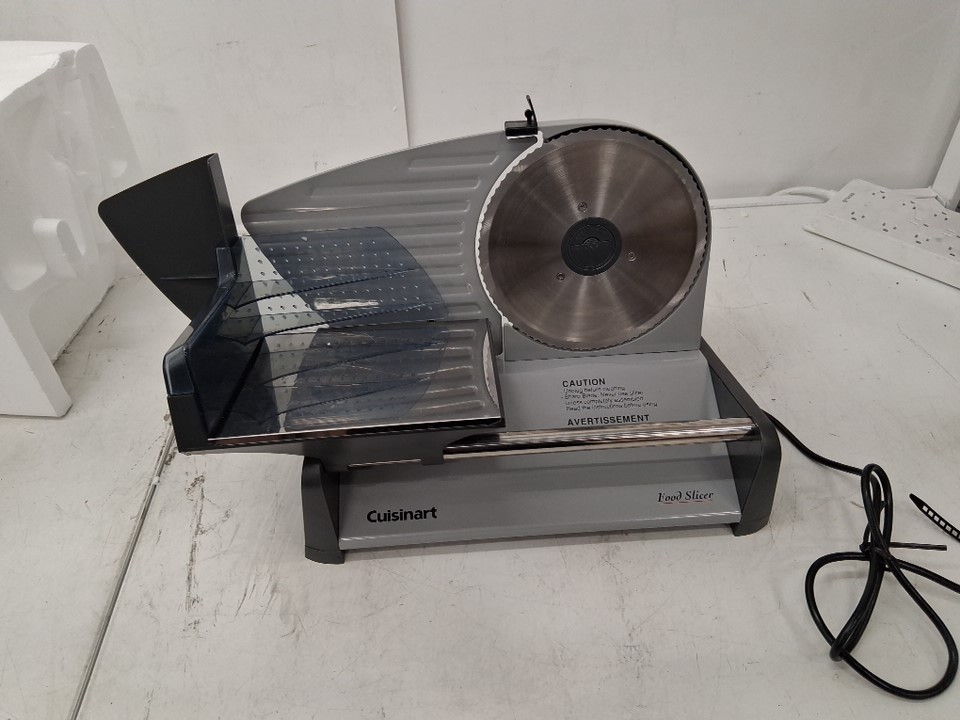 Power is functional, but the rotation system appears to be getting caught on something internally, preventing the blade from spinning. Could potentially be restored to proper function by opening the machine and unblocking whatever is getting stuck. There are also some smudges and light stains on the blade and cutting surface implying some previous use, but the machine appears in good condition overall - see photos