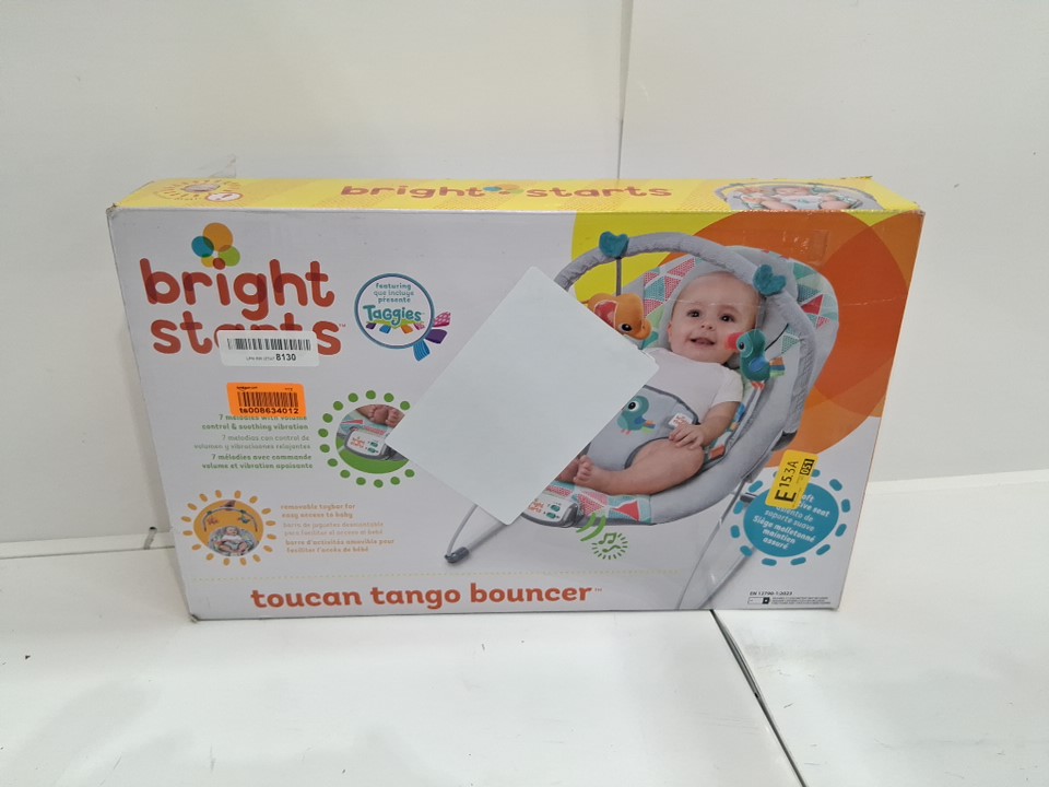 BRIGHT STARTS BABY BOUNCER SOOTHING VIBRATIONS INFANT SEAT - TAGGIES, MUSIC, REMOVABLE-TOY BAR - 0-6 MONTHS UP TO 20 LBS - TOUCAN TANGO (MODEL: ‎10589-ES)