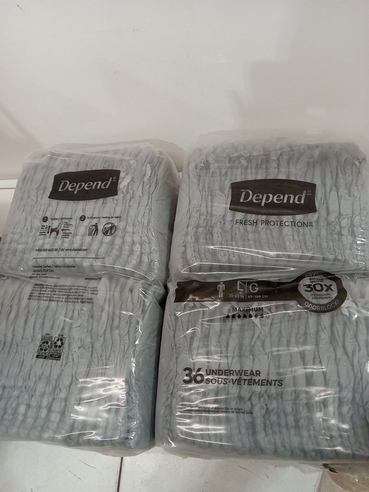 72PK MENS DEPENDS MAXIMUM ABORPTION INCONTINENCE DIAPERS WITH DRYSHIELD TECHNOLOGY LARGE - GREY - (MODEL: 54203)