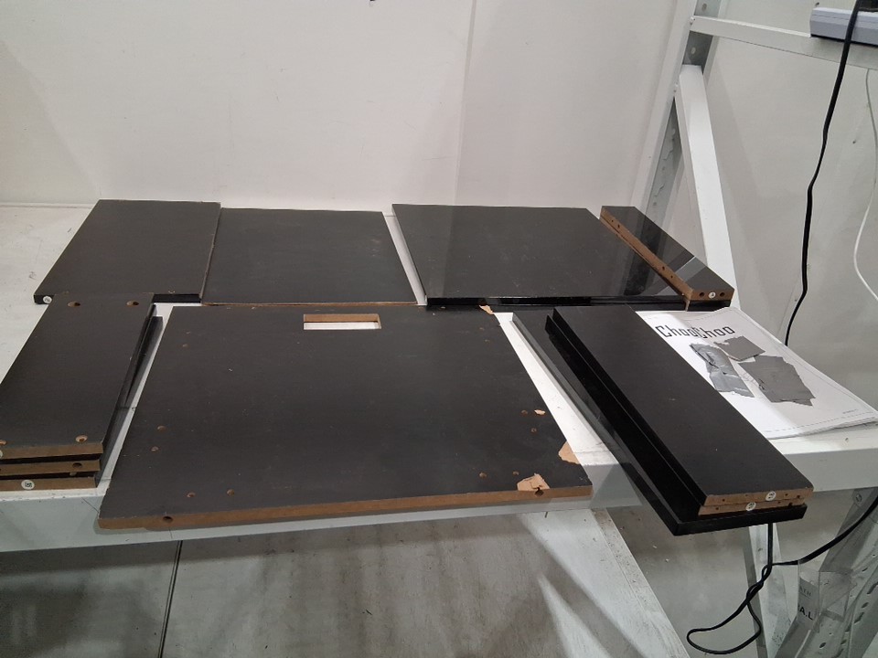 Some parts of the item have scratches and chipped wood, and the LED lights are missing.